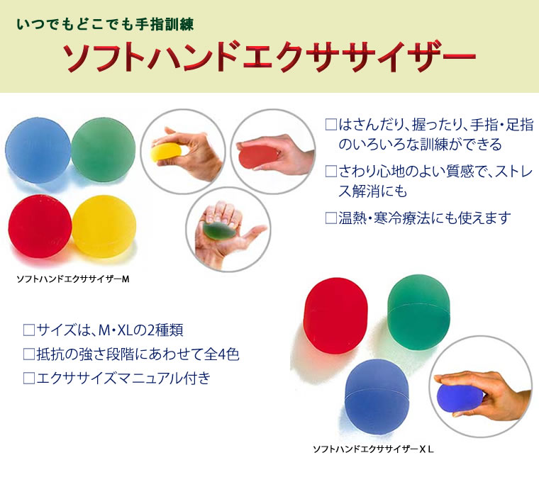 □■機能 ・指先で挟んだり、手のひら全体で握るなどします。 ・手指の運動性や握力を強化し、血行を促す効果があります。 □■規格 材質 :非ラテックスポリマー サイズ:直径4.5cm(Mサイズ) 重さ :70g 種類 : ・黄/抵抗:弱 抵抗力:0.7kg ・赤/抵抗:中弱 抵抗力:1.4kg ・緑/抵抗:中 抵抗力:1.8kg ・青/抵抗:中強 抵抗力:3.6kg 在庫限定 ※抵抗力とは半分につぶした時の抵抗です。 ※エクササイズマニュアル付き 個数 :1個入 □■対象者 (1)関節炎や慢性腱炎の方 (2)脳卒中の回復期にある方をはじめ、ストレス軽減や筋力アップをお望みの方 (3)様々な疾患で手指の運動障害がある方(小児、女性、中高年におすすめ) □■災害対策として 避難所や仮施設などでの、長期滞在時の運動不足やストレス解消としても利用できます。 ★ 大型サイズのソフトハンドエクササイザーXLはこちらです。