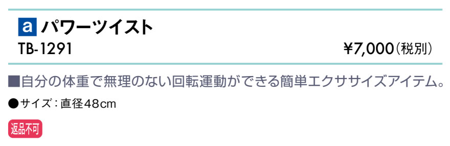 製品の仕様 サイズ 直径48cm 配送について 大型商品(大型宅配便)について お届けは玄関の前まで、ビルやマンションの場合は共同玄関口までの配達となります。配達員は1名でお伺いをいたしますので、トラックからの荷下ろし、 搬入が困難な場合、お客様にお手伝いをお願いしております。 再配達について 路線便での配送となるため、不在時の持ち帰りや再配達の際に別途費用が発生します。ご不明な点はお問い合わせください。 搬入・設置組立について 時間指定や階段を利用しての搬入、設置組立をご希望の場合も別途費用が発生します。必要な場合は予めご相談ください。 個人宅への配送について ご注文時の備考欄に(施設名・屋号・予定名称)をご記入ください。お届け先が個人様宛の場合、別途送料が必要です。 北海道・沖縄・離島へのお届けについて 追加送料が発生します。法人様につきましても追加送料分のご負担が必要です。 サポート情報 ※メーカー希望小売価格はメーカーカタログに基づいて掲載しています。TB-1291 パワーツイスト 自分の体重で無理のない回転運動ができる簡単エクササイズアイテム。 高田ベッド製作所正規特約店のエンバシーで安心をプラス! ご注文はこちらから