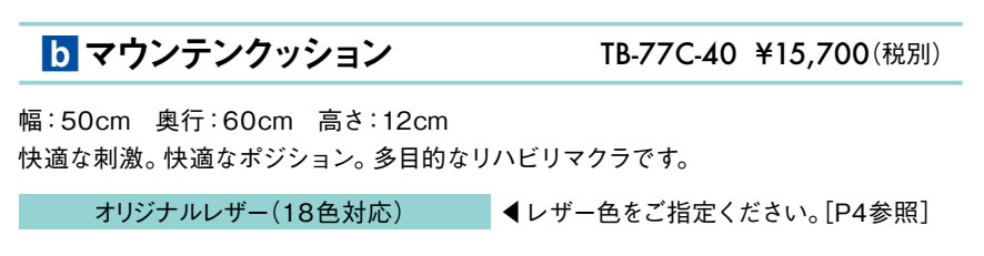 製品の仕様 幅 25- 30 - 35 - 40 - 45 - 50cm 奥行 25cm 高さ 20cm 配送について 大型商品(大型宅配便)について お届けは玄関の前まで、ビルやマンションの場合は共同玄関口までの配達となります。配達員は1名でお伺いをいたしますので、トラックからの荷下ろし、 搬入が困難な場合、お客様にお手伝いをお願いしております。 再配達について 路線便での配送となるため、不在時の持ち帰りや再配達の際に別途費用が発生します。ご不明な点はお問い合わせください。 搬入・設置組立について 時間指定や階段を利用しての搬入、設置組立をご希望の場合も別途費用が発生します。必要な場合は予めご相談ください。 個人宅への配送について ご注文時の備考欄に(施設名・屋号・予定名称)をご記入ください。お届け先が個人様宛の場合、別途送料が必要です。 北海道・沖縄・離島へのお届けについて 追加送料が発生します。法人様につきましても追加送料分のご負担が必要です。 サポート情報 ※メーカー希望小売価格はメーカーカタログに基づいて掲載しています。TB-77c-127 スロップ 長時間の施術でもズレない安定性を実現するストップレザーを採用。 レザーカラーは18色のオリジナルレザーからお選びいただけます。 メディカル専用に開発された5つの特性を持つ高耐久ビニルレザーです。 高田ベッド製作所正規特約店のエンバシーで安心をプラス! ご注文はこちらから