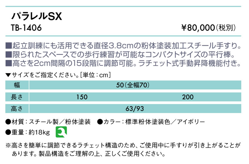 製品の仕様 重量 約18kg 幅 50cm(全幅70) 長さ 150 - 200cm 高さ 63〜93cm 材質 スチール製 / 粉体塗装 カラー 標準粉体塗装色 / アイボリー 組立の有無 組立必要(スパナ付属) 配送について 大型商品(大型宅配便)について お届けは玄関の前まで、ビルやマンションの場合は共同玄関口までの配達となります。配達員は1名でお伺いをいたしますので、トラックからの荷下ろし、 搬入が困難な場合、お客様にお手伝いをお願いしております。 再配達について 路線便での配送となるため、不在時の持ち帰りや再配達の際に別途費用が発生します。ご不明な点はお問い合わせください。 搬入・設置組立について 時間指定や階段を利用しての搬入、設置組立をご希望の場合も別途費用が発生します。必要な場合は予めご相談ください。 個人宅への配送について ご注文時の備考欄に(施設名・屋号・予定名称)をご記入ください。お届け先が個人様宛の場合、別途送料が必要です。 北海道・沖縄・離島へのお届けについて 追加送料が発生します。法人様につきましても追加送料分のご負担が必要です。 サポート情報 ※メーカー希望小売価格はメーカーカタログに基づいて掲載しています。TB-1406 パラレルSX 起立訓練にも活用できる直径3.8cmの粉体塗装加工スチール手すり。限られたスペースでの歩行練習が可能なコンパクトサイズの平行棒。高さを2cm間隔の15段階に調節可能。ラチェット式手動昇降機能付き。※高さを簡単に調節できるラチェット構造のため、ご使用中に手すりが引き上がることがあります。製品構造をご理解の上、正しくご使用ください。 フレーム塗装に粉体塗装を採用!木材は全てF☆☆☆☆で安全安心です。 高田ベッド製作所正規特約店のエンバシーで安心をプラス! 関連商品はこちら(孔加工の有無やサイズ違い、オプションなど) パラレルSD ご注文はこちらから