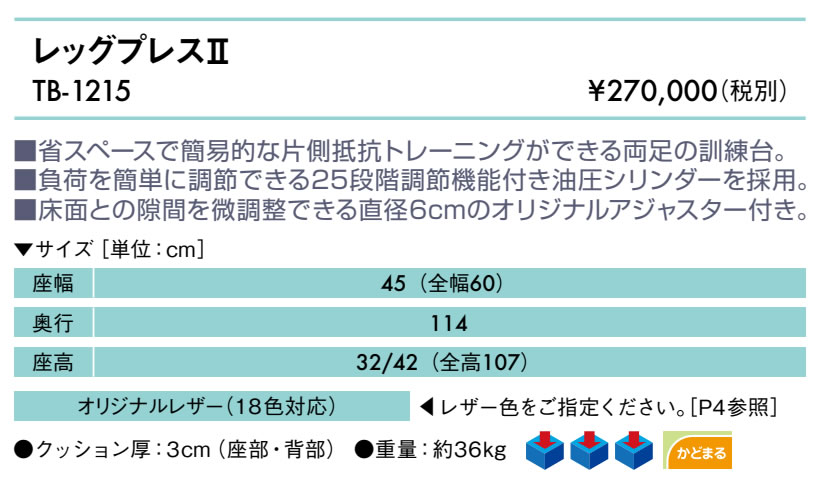製品の仕様 クッション厚 3cm 重量 約36kg 幅 45cm(全幅60) 奥行 114cm 座高 32/42cm(全幅107) 組立の有無 組立済み 強度レベル(メーカー指標 5段階) 1つのアイコンに対し製品強度(等分布荷重)は100kgです。 配送について 大型商品(大型宅配便)について お届けは玄関の前まで、ビルやマンションの場合は共同玄関口までの配達となります。配達員は1名でお伺いをいたしますので、トラックからの荷下ろし、 搬入が困難な場合、お客様にお手伝いをお願いしております。 再配達について 路線便での配送となるため、不在時の持ち帰りや再配達の際に別途費用が発生します。ご不明な点はお問い合わせください。 搬入・設置組立について 時間指定や階段を利用しての搬入、設置組立をご希望の場合も別途費用が発生します。必要な場合は予めご相談ください。 個人宅への配送について ご注文時の備考欄に(施設名・屋号・予定名称)をご記入ください。お届け先が個人様宛の場合、別途送料が必要です。 北海道・沖縄・離島へのお届けについて 追加送料が発生します。法人様につきましても追加送料分のご負担が必要です。 サポート情報 ※メーカー希望小売価格はメーカーカタログに基づいて掲載しています。TB-1215 レッグプレスII 省スペースで簡易的な片側抵抗トレーニングができる両足の訓練台。負荷を簡単に調節できる25段階調節機能付き油圧シリンダーを採用。床面との隙間を微調整できる直径6cmのオリジナルアジャスター付き。 製品の特徴 レザーカラーは18色のオリジナルレザーからお選びいただけます。 メディカル専用に開発された5つの特性を持つ高耐久ビニルレザーです。 フレーム塗装に粉体塗装を採用!木材は全てF☆☆☆☆で安全安心です。 高田ベッド製作所正規特約店のエンバシーで安心をプラス! ご注文はこちらから