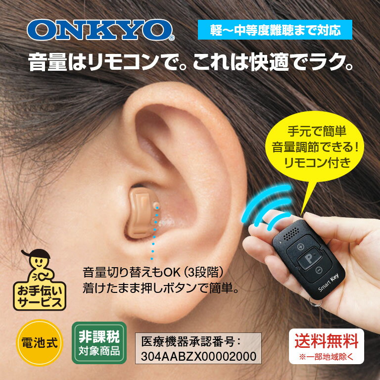 商品説明耳穴にすっぽり。周りの人もご自身も装着を感じないほど小型。最先端技術のデジタル12チャンネル搭載!雑音の抑制を強化!音量はリモコンで。これは快適でラク。デジタル12チャンネル搭載!「処理能力」が1.5倍 ※ に。 (※同社旧シリーズとの比較)有名音響メーカー「ONKYO」の新型補聴器が登場。耳穴にすっぽり収まる超小型・軽量鼓膜近くまで音を伝えられるよう、計算された新開発のデザイン、しかもハウリング(ピー音)も防ぐので、とても快適。リモコンで簡単調整でき、テレビモード搭載で家族と一緒に快適視聴!【 商品詳細 】●サイズ(約)/幅9×奥行17×高13mm●重さ(約)/0.9g(電池含まず)●材質/セルロースアセテートプロピオネート、アクリル樹脂、ポリアミド樹脂●最大音響利得/ピーク値:55dB、高周波数平均値:49dB●90dB最大出力音圧レベル/ピーク値:116dB SPL、高周波数平均値:112dB SPL●電源/空気電池(PR-41)×2(テスト用付属)●電池寿命(約)/150時間●保証期間/1年●広告文責/日本直販株式会社●メーカー・販売業者/ONKYO●区分/医療機器●生産国/シンガポール●医療機器認証番号:第304AABZX00002000号※「オンキヨー」、「Onkyo」はオンキヨー株式会社の商標または登録商標です。別売品・関連商品はこちらからオンキヨー 耳穴型 デジタル 補聴器 リモコン付き 片耳はこちら>オンキヨー 耳穴型 デジタル 補聴器 リモコン付き 両耳はこちら>>