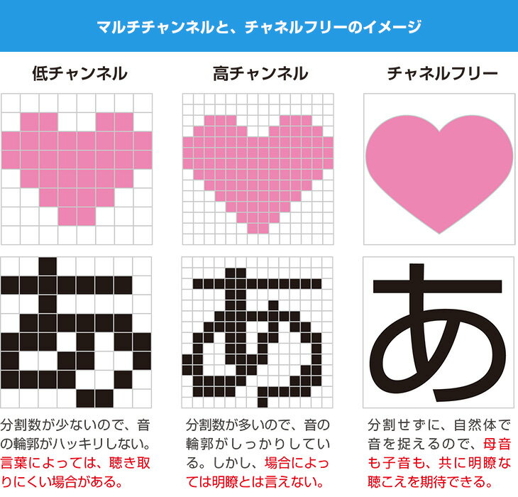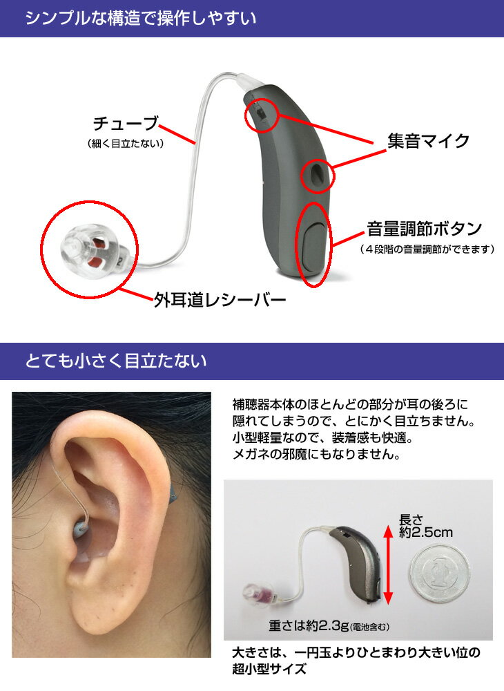 メーカー希望小売価格はメーカーカタログに基づいて掲載しています 本商品は片耳用(1個)もございます。 超小型ながら高性能。軽度〜高度難聴まで対応する、ワンランク上のデジタル式補聴器です。 メーカー希望小売価格280,000円のところ… 通販天国特価169,600円(非課税) 耳に隠れるほど小さいのに、「会話がよく聞こえる」。その秘密は2つのハイテク技術! ■鼓膜の近くで音が出る「外耳道レシーバー式」 ■言葉が明瞭に聞こえる信号処理テクノロジー「チャネルフリー方式」 ■Bluetoothでスマートフォンと接続すれば、スマートフォンでも音量調節が可能です。 スイス大手補聴器メーカーの上位機種で、購入後の調整(カスタマイズ)や購入前の調整(セミオーダー)にも対応。 最大音響利得54dBとパワフルな音量で、軽度難聴〜高度難聴まで対応します。 「外耳道レシーバー」で音を劣化させずに耳に届ける! 従来の耳掛け補聴器は、本体で集音した音がチューブを通り、イヤピースから耳の中へ音を伝えていました。 アクトス補聴器PRは違います。 イヤーピース部分にレシーバー(スピーカー)が収められており、本体で集音した音はチューブを経由せず、ダイレクトに鼓膜の近くで音を出す構造です。 だから、こもった音質にはならず、びっくりする程に音が明瞭です。 硬いチューブを耳に引っかける事はなく、ソフトで極細なコードを耳にかけるだけなので、 目立たない上に、耳まわりが痛くなる事はありません。 メガネの邪魔にもならないので、普段からメガネをご使用されている方にもオススメです。 豊かな音質で聴こえが鮮明!「チャネルフリー」搭載 一般的なデジタル補聴器には、チャンネルというものが存在しています。 チャンネル数とは、「補聴器が音を何分割してデジタル処理を行うか」を表す数値です。 チャンネル数が多い程、より滑らかで自然な聴こえになります。 例えば4チャンネルと8チャンネルを比べた場合、8チャンネルの方がより細かく処理を行うため、優れた音質です。 しかし、人間の「耳本来」の聴こえには、チャンネルという概念はありません。 耳本来の聴こえは、補聴器の聴こえよりも遥かに優れているからです。 つまり、もし特別な技術でチャンネルが、耳本来の聴こえと同じように、音を区切らず滑らかな調整が可能になれば、 それは限りなく耳本来の聴こえに近づく事ができるということ。 その考えに基づき、スイスの大手補聴器メーカーで開発されたのが 世界初の技術、「チャネルフリー」機能です。 また、このチャネルフリー機能には音声の処理に特徴があります。 従来のデジタル式補聴器の処理と、チャネルフリー処理の違いを図にいたしました。 ▼従来のマルチチャンネル・デジタル補聴器の音声処理 従来通りのマルチチャンネルのデジタル補聴器は、音声をチャンネルに分けて処理をするとき、 母音と子音の処理を一緒に行ってしまいます。 その為、母音と子音の区別がつきにくく、チャンネル数が多くあったとしても、 最終的に耳に伝わる音に母音と子音の強弱をつける事はとても難しい事でした。 ▼チャネルフリー補聴器の音声処理 しかし、チャネルフリー機能を搭載した補聴器は、母音と子音を分けて処理を行います。 それにより、子音部分を母音よりも強調し、聴こえづらい言葉を明瞭に! これもチャネルフリー機能の大きなメリットです。 一般的な多くの通販補聴器とは全く異なる技術。まさに、デジタルを超えた、「ネオ・デジタル」。 一部の補聴器でしか搭載されない、最先端の音声処理機能を搭載いたしました。 音の切れ目を感じさせず、聴こえづらい音もきちんと耳に伝える。 精密な音声処理を行うため、ハウリング(ピーピー音)もほとんど起こりません。 今までになかった「豊かな音質」をお試しください。 「4種類の耳せん」でいつでも快適! 耳せんは4種が付属されています。 お客様のお耳に合わせて、フィットするものをご使用ください。 ・スタンダード耳せん(小、大) 購入時には小タイプが取り付けられています。 補聴器を通常使用されるときに最適な耳せんです。 ・オープン耳せん スタンダード耳せんでは、こもったり、詰まった感じがする場合に使用します。 空気穴が開いており、通気性のよい耳せんです。 ・パワー耳せん 一般的な耳せんが2枚重なった形状で、しっかりと耳穴で固定されるタイプの耳せんです。 音量を大きくして使用する方向けの耳せんです。 音量調節は4段階 わずらわしい音量調整はシンプルに、4段階の調整が可能です。 指で触ればすぐわかる突起が付いてますので、そこを軽く押すだけの音量調整です。 手先が不器用な方でも押しやすいデザインです。 ボリュームボタンを押すと、「ピッ」という音で、音量の変化をお知らせします。 電話での使用にも対応 豊かな聴こえはそのままに。 固定電話や携帯電話も、本体マイクに近づけるだけで、はっきりとした集音が可能です。 通話時のハウリングも起