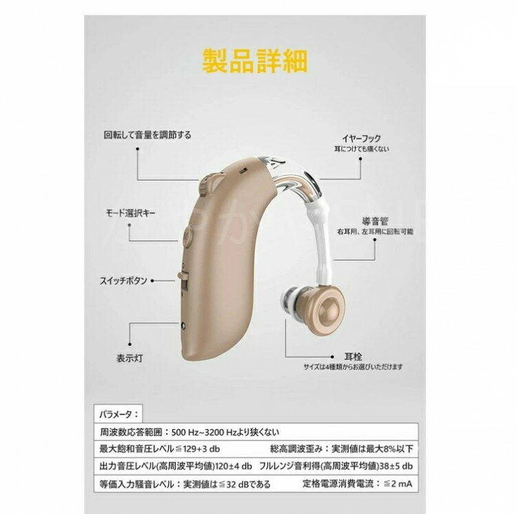 商品説明【高音質集音・高齢者向け】音を最大約30倍大きくすることができ、話し声やテレビの音を大きくしてくれ、か すかな声でも聞こえます。高齢者に向け、敬老の日の喜ばれるギフトとしてもお勧めです。 【耳掛けタイプ・左右両用】耳の後ろにまわして、ひっかけて固定し、落ちる心配はなく、楽々に利用できます。 右耳にも左耳にも使用可能、耳の聞き状況に合わせて自由に使えます。 【操作簡単・モード4段階調整】 「M」ボタンを押すと、モード調整ができ、さまざまな環境での使用に適しています。ボタンを押すと、集音器から「ビィー」という音がします。何回か鳴らすと対応の段階モード数になります。(例えば1回なる場合、モード数は1です)。 【小型軽量・快適なつけ心地】コンパクトで軽量化に設計され、耳周りにぴったりフィットしてくれます。本体重さ はわずか5gで、耳に負担をかけず、長時間つけても快適なつけ心地を楽しめます。小型で肌に近い色で耳に つけても目立ちにくく、気軽に着用いただけます。 【充電式・長時間稼働】USB充電式の仕様に仕上がり、繰り返して電池交換の手間を省け、充電ポートに 差し込むだけで充電できます。満充電の場合には、14時間連続の使用が可能となり、お出かけや旅行、アウ トドアシーンなどにも心置きなくご利用いただけます。注意事項 ※お問い合わせとメールを承りますので、質問や苦情を相談して有効に解決しましょう。勝手に悪いレビューをしないでお願い致します。 ※背景の小物等は撮影用のイメージで、商品には含まれません。 ※商品仕様は、予告無く仕様変更される場合がございます。予めご了承下さい。 ※実店舗と在庫を共有しているため、突然の売り切れの可能性があります。 ※モニターの発色具合によって、実際の色と異なる場合があります。品質保証 ◎※販売している商品は全て新品未使用です、倉庫から出荷前に検品必要ですので、箱を開封する場合もございます、予めご了承くださいませ。 ◎※初期不良の場合は到着後7営業日以内にご連絡ください。 ◎※初期不良の場合は写真や動画を送って下さい、確認後無料で新品交換もしくは御返金致しますのでご連絡下さい。 ◎※写真や動画を送っていただけない場合は技術者と確認できません、返品返金対応出来ない可能性が御座います、予めご了承くださいませ。 ※製造時期によりデザインや仕様に若干の変更がある場合がございます。予めご了承ください。 ※本機を利用したことによる、直接もしくは間接的に生じた損害、破損について当店は一切の責任を負いません。 ※パッケージや衣装箱が予告無く変更になる場合がございます。ご不明な点がございましたら、お気軽にお問い合わせください。商品説明【高音質集音・高齢者向け】音を最大約30倍大きくすることができ、話し声やテレビの音を大きくしてくれ、か すかな声でも聞こえます。高齢者に向け、敬老の日の喜ばれるギフトとしてもお勧めです。 【耳掛けタイプ・左右両用】耳の後ろにまわして、ひっかけて固定し、落ちる心配はなく、楽々に利用できます。 右耳にも左耳にも使用可能、耳の聞き状況に合わせて自由に使えます。 【操作簡単・モード4段階調整】 「M」ボタンを押すと、モード調整ができ、さまざまな環境での使用に適しています。ボタンを押すと、集音器から「ビィー」という音がします。何回か鳴らすと対応の段階モード数になります。(例えば1回なる場合、モード数は1です)。 【小型軽量・快適なつけ心地】コンパクトで軽量化に設計され、耳周りにぴったりフィットしてくれます。本体重さ はわずか5gで、耳に負担をかけず、長時間つけても快適なつけ心地を楽しめます。小型で肌に近い色で耳に つけても目立ちにくく、気軽に着用いただけます。 【充電式・長時間稼働】USB充電式の仕様に仕上がり、繰り返して電池交換の手間を省け、充電ポートに 差し込むだけで充電できます。満充電の場合には、14時間連続の使用が可能となり、お出かけや旅行、アウ トドアシーンなどにも心置きなくご利用いただけます。注意事項 ※お問い合わせとメールを承りますので、質問や苦情を相談して有効に解決しましょう。勝手に悪いレビューをしないでお願い致します。 ※背景の小物等は撮影用のイメージで、商品には含まれません。 ※商品仕様は、予告無く仕様変更される場合がございます。予めご了承下さい。 ※実店舗と在庫を共有しているため、突然の売り切れの可能性があります。 ※モニターの発色具合によって、実際の色と異なる場合があります。品質保証 ◎※販売している商品は全て新品未使用です、倉庫から出荷前に検品必要ですので、箱を開封する場合もございます、予めご了承くださいませ。 ◎※初期不良の場合は到着後7営業日以内にご連絡ください。 ◎※初期不良の場合は写真や動画を送って下さい、確認後無料で新品交換もしくは御返金致しますのでご連絡下さい。 ◎