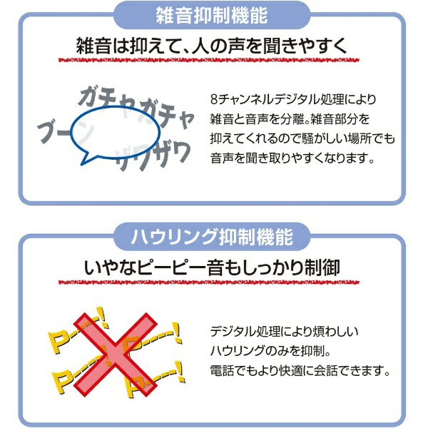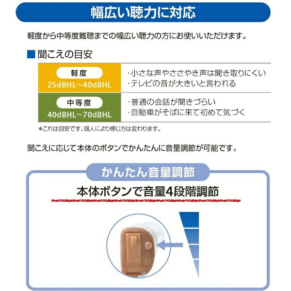 装着が簡単。装用感抜群の耳あな型。コンパクトでも高性能最大音響利得 49dB(ピーク時)を実現しており、軽度から中等度難聴まで対応します。聴きたい音を、より自然な聴こえにOHS-D21は補聴器に入ってくる音を8分割にして処理しています。チャンネル毎に不要な生活雑音は抑え、聴きたい音や会話をより自然で滑らかに聴くことができます。不快な“ピーピー音”を抑制不快な(ピーピー音)を抑える「ハウリング抑制機能」を搭載し、音をより聴こえやすくしました。4段階の音量選択が、プッシュボタンで簡単ボタンを押すだけで、聴力に合わせて音量を4段階で切り替えることができます。目立ちにくいコンパクトデザイン耳の中にすっぽり収まる幅9mm×奥行17mm×高さ13mm。左右専用のため、快適な装着感耳の形状に合わせるために左右別々の形状になっています。穴の形やお好みに合わせることができる様々な形の耳穴にフィットしやすい様に 大・中・小の3サイズのドームを同梱 ----------------------------------------------------------------------------広告文責:株式会社ビックカメラ楽天 0570-01-1223メーカー:オンキヨー ONKYO商品区分:補聴器----------------------------------------------------------------------------【rb_remp】