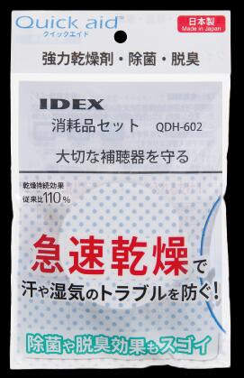 ●クイックエイドプラス本体x1 クリスタルホワイト QA-31F ●ドライケースx1 メーカーはこちらで決めさせていただきます。 ●クイックエイド消耗品x3 QDH-602 セットになります サイクロン式のファン(風乾燥で)補聴器を素早く乾燥! 速乾!電源ボタンを押して、スピード乾燥20分!自動タイマーオフ機能付き! 安心!熱を使わない風乾燥! 長持ち!アルカリ電池2本(別売り)使用で、約5か月動作! <使い方> 単4アルカリ電池2本をいれ、乾燥ケースのフタをクイックエイドプラス本体と付け替え、 電源ボタンを押してOK!(運転ランプが約20分間点灯します。電池残量が少なくなると、点滅して交換をお知らせ) *クイックエイドプラスは、大半の補聴器用乾燥ケースにご使用できます! 使用可能メーカー(2019年現在) ワイデックス、フォナック、NJH、GNヒヤリング、オーティコン、スターキー、リオネット、コルチトーン、バーナフォン *各社乾燥ケースのデザイン、仕様は改良その他により予告なく変更される場合がございます。 <仕様>電池は付属されておりません。 品名:補聴器乾燥器 クイックエイドプラス 型番:QA-31F 寸法:直径74mm×高さ37mm 質量:約70g(乾電池含まず) 電源:単4アルカリ乾電池×2本(別売り) 付属品:クッションシート1枚、取り扱い説明書(保証書付) クイックエイド消耗品セットを一緒に使うことでさらに強力乾燥+除菌+消臭 乾燥剤の交換目安は2ヵ月。 湿度検知紙の色が青からだんだんと薄くなりピンクになったら交換のサインです。