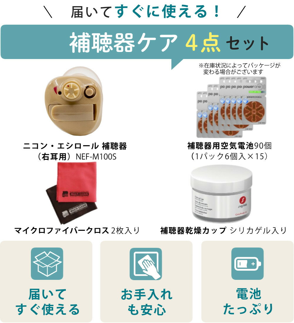 セット内容 1)非課税 ニコン・エシロール NEF-M100S 右耳用 【メーカー保証】1年間 【付属品】本体、お試し用空気電池1個、耳せん(S・M・L×各1個)、携帯用ケース、掃除用ブラシ、取扱説明書、保証書 2)補聴器用空気電池 PR41(312) 6個入×15パック 3) シグニア 補聴器乾燥カップ シリカゲル入 4)当社オリジナル マイクロファイバークロス 2枚入り 充実機能の日本製デジタル補聴器「ニコンNEF-M100」 ニコンブランドの技術を結集、簡単操作を極めた至れり尽くせりの耳あな型デジタル補聴器(軽度-中等度難聴用)です。 デジタル音声処理による聞こえの最適化はもちろん、大変だった電池交換のお悩みも解消される画期的な「ラクラク電池交換方式」を採用など、補聴器を使う人のことを考え抜いた「耳にやさしく、操作も簡単な設計」になっています。 ●Point 1 初めてでも簡単で安心! ・耳あなにフィット ベージュ色で目立ちにくく操作が簡単な耳穴タイプ。 眼鏡やマスクの邪魔にもなりません。 ・可変式ボリュームダイヤル 指の腹で少しずつ回すと徐々に音量が変化します。 場面ごとにお好みの音量に合わせて使用できます ●Point 2 高齢の方に優しい設計 ・ラクラク電池交換方式 電池を裏表どちらにいれてもOK! 特に小さくて交換しにくい空気電池だから助かる! ・ハウリングキャンセラー機能 補聴器で最も不快なピーピー音を デジタルで自動抑制する機能を搭載 ●Point 3 押すだけ切替・便利機能 ・2種類の聞こえを選べます モード切替プッシュスイッチを押して、 お好みの聞こえモードで使えます。 ・リラックスモード 周囲が騒がしい所で静かに聴きたい時 ・アクティブモード 病院や会合など大切な会話を聞き逃したくない時 ●Point 4 保障面も充実で安心 一般の補聴器は… ・通常使用時の動作不良、自然故障のみ保証対象 ・お客様過失による自損故障は保証対象外 破損 水没 ニコン安心保障パックはお客様よりお問い合わせの多い 2つのお悩み事を保証範囲を広げカバー! ※1年間の保証期間どれか1回のみの適応です 日常でありうる保障が付いてるから安心して補聴器が買えますね ●補聴器のお手入れ ケースに付属のブラシを使用し隅々までお手入れ可能 音が出ない、音が弱い、音が割れて聞こえる等 これらの多くの原因は補聴器に耳垢が詰まる事で発生することがあります。 毎日ご使用後は、軽くブラシで耳垢を掃除して下さい。補聴器を長くお使い いただくためにも、ご使用後はよく手入れをしてください。 ◆耳せんの交換 マグネット付ブラシで掃除をしても聞こえが悪い場合や、耳せんが 緩くなるなど劣化した場合は耳せんを新しいものと交換してください。 対象 軽度〜中等度難聴の方 サイズ(約) 奥行22.3×幅14.9×高さ14.5mm 重さ 約1.5g(電池を含む) カラー ベージュ系 材質 本体:ABS樹脂、耳栓:シリコンゴム 電池 無水銀空気電池PR41(1個) 電池寿命 約180時間(連続使用) 最大音響利得(HFA) 25dB±5dB(ピーク値:30dB+3dB以下) 90dB最大出力音圧レベル(HFA) 103dB±4dB(ピーク値:105dB+3dB以下)JIS C5512:2015(2?カプラ測定) 付属内容 本体、お試し用空気電池1個、耳せん(S・M・L×各1個)、携帯用ケース、掃除用ブラシ、取扱説明書、保証書 生産国 日本製 【製造者・区分】 株式会社ニコン・エシロール 区分/管理医療機器  医療機器認証番号/302AABZX00046000 広告文責/株式会社ホームショッピング TEL:011-711-2266 ▼スタッフの一言 ニコンエシロールの 補聴器 は、高齢者 の 補聴器選び に最適な シニア向け 補聴器です。 優れたデジタル音響技術と 初心者 でも使いやすい シンプル なデザインが特徴です。 小型 で 軽量 、目立たない製品から 高機能 を備えたモデルまで、幅広いニーズに応える ラインナップが揃っています。これらの 補聴器 は、クリアな 音質 と快適な 装着感 を提供し、 日常生活の質を向上させることを目指しています。