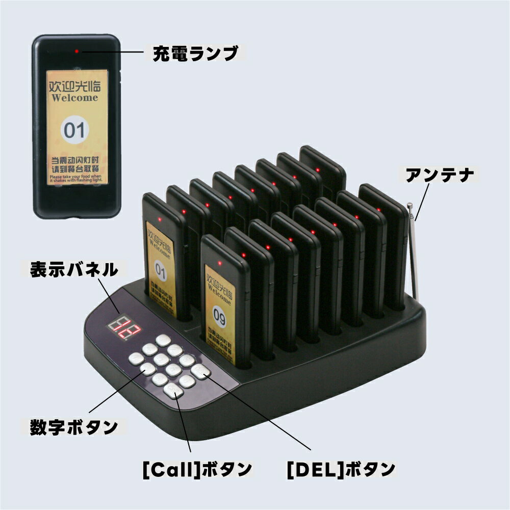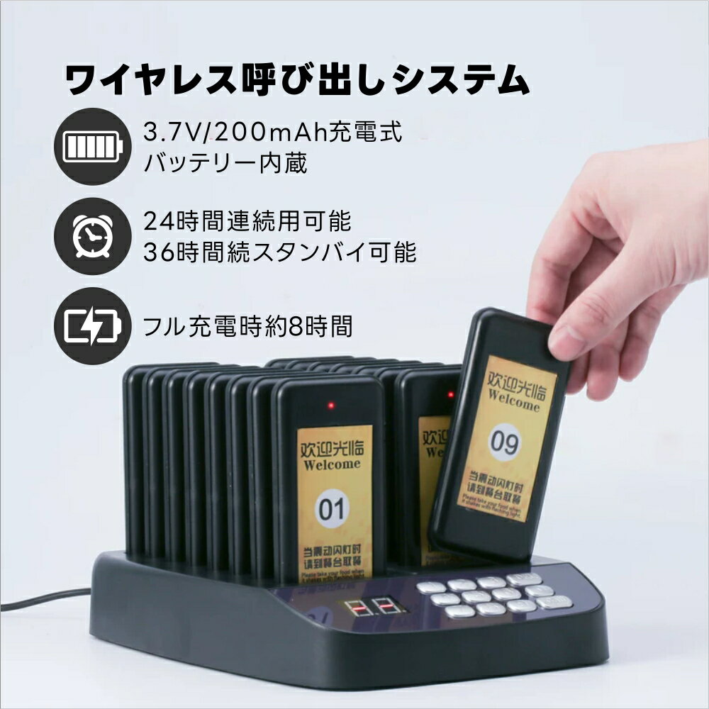 ■【操作が簡単】ボタンを押すだけで誰でも簡単に操作できます。呼び出しベルを充電し、送信機(親機)のキーボードに『番号』を押し、『CALL』ボタンを押すだけで、お客様にお知らせすることができます。ブザー停止ボタン搭載のため、お客様に不快感を与えません。 ■【幅広い用途】本製品は、カフェ、ファーストフード、フードコート等で使用されているお客様を呼び出すシステムです。ファミレス、居酒屋などの飲食店のオーダーや呼び出し、介護現場や病院等での緊急呼び出し、又は遊園地やホテル、ネットカフェ、駐車場、エステ、工場等使用場所はアイデア次第です。人件費の削減やサービス向上にお役立て頂けます。 ■【感染対策】密閉空間、密集場所、密接場面を避ける「3密」対策として、お客様の行列が長くなるのを避け、最大限に長時間に待ち詫びるお客様を抑え、飲食店・レストラン・病院・クリニック・学校・幼稚園等での導入実績が多数あります。密集した場所での混雑した行列が長くなって引き起こされる交差感染を回避できます。 ■【商品の機能】性能が安定し、超遠距離発射、従来品と比べ、送受信距離も大幅にUP!!最大受信範囲約1000メートル!広い店舗でも安心!(*建物の構造や建築材料によって送受信距離は変動します。)バッテリー持続時間も文句なしの約30時間!呼び出しベルは3つのリマインダーモード(振動/ブザー/振動+ブザー)があり、LEDライト付きの呼び出しベルは、同時にビープ音と振動をサポートし、ゲストを効果的に思い出させることができます。 ■【耐湿、耐衝撃、安心保証】受信機(子機)はシンプルな設計で、IP55防水技術を採用し、消毒にも便利です。ABSエンジニアリングプラスチック素材、耐久性と長寿命で構成されております。本製品にはお買い上げ日より、1年間の保証が付いておりますので、ご安心してお買い求めくださいませ。 ~~~~~~~~~~~~~~~~~~~~~~~~~~ 🔳 本製品は呼び出し番号チャネルが98番まで対応していますので、1~ 98の任意の呼び出し番号をペアリングすることが可能なモデルです。 🔳一台本体を複数の子機に(子機が同じ番号でも)対応できます。 🔳 (簡単増設)受信機(子機)の紛失が起こっても新たな受信機(子機)に番号をペアリングし直すことで長くお使い続けて頂くことができます。また、必要に応じて受信機(子機)の数を増やしてご使用になることもできます。 【注意事項】 1.透明板の両面の保護フィルムをはがしてご使用ください。 2.本製品は工場でセットアップされています。出荷前に社内で全て品質の点検を受けており、商品をお受け取りしましたら、20~30分ほど充電してから使用することをお勧めします。 3.呼び出しベルは電源を入れると電力を消費するので、夜間に使用しないときは電源を切ることをお勧めします。 ●工事不要で、電源を入れて、すぐ使用できます♪ ●スマートなデザイン、タッチボタン ●IP55防水技術を採用し、耐水性、耐油性抜群! ==========================