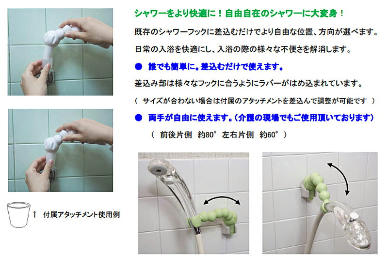 ・既存のシャワーフックに差し込みだけで、より自由な位置、方向が選べます。 ・日常の入浴を快適にし、入浴の際の様々な不便さを解消します。 ・誰でも簡単に差し込むだけで使えます。 ・差込部は様々なフックに合うようにラバーがはめ込まれています。 ※サイズが合わない場合は、付属のアタッチメントを差し込んで調整が可能です。 ・両手が自由に使えます。 ※前後片側 約80度、左右片側 約60度 ●サイズ/幅17×奥行5×高さ12cm ●重量/約110g ●材質/ 本体:ABS樹脂 差込部:(内側)ABS、(外側)エラストマー フック部:ポリアセタール ジョイント部:ポリアセタール ●メーカー品番/USH-01WH ●JANコード/4571167010202 ●メーカー名/増田樹脂化学工業