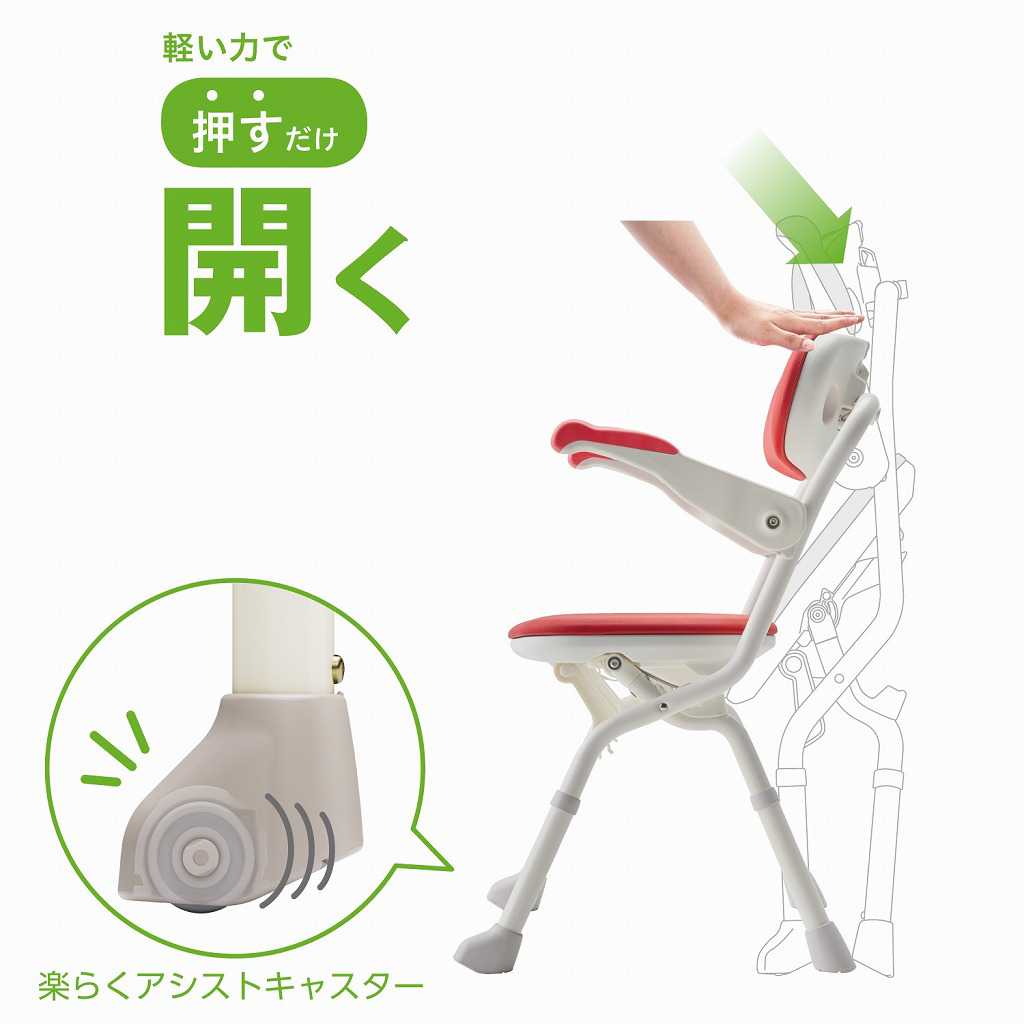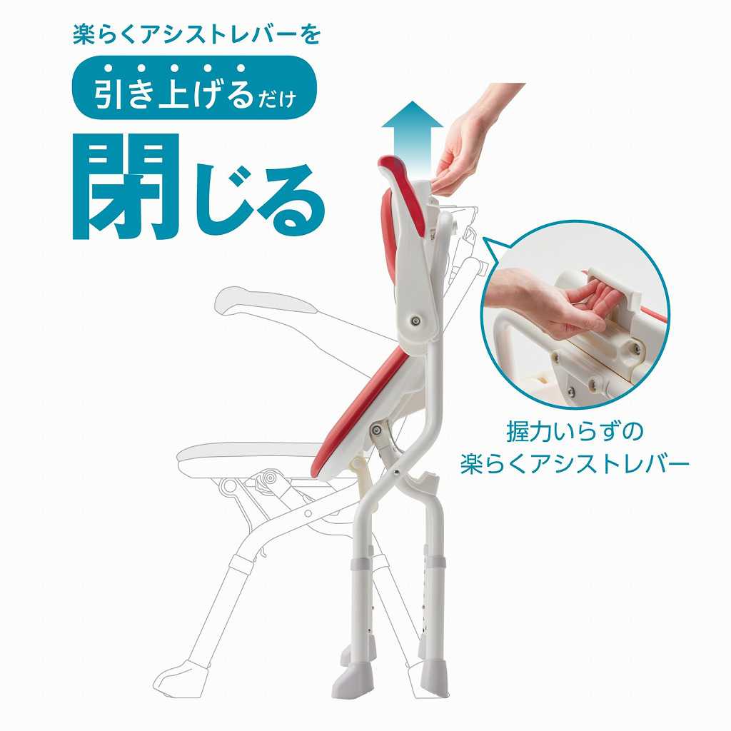 ・誰でも簡単開閉シャワーベンチ! ・背もたれ上面のレバー部を軽い力で押すだけで、いすの状態にできます。 ・前脚に「楽らくアシストキャスター」を搭載。開く動きをアシストします。 ・前かがみにならずに折りたためる、腰・膝に配慮した折りたたみ設計。引き上げるだけで折りたためるので、握力の弱い方、関節疾患の方でも楽に操作できます。 ●サイズ/幅46×奥行48〜53×高さ71〜83(7段階/2cm)cm、折りたたみ時:奥行16×高さ83.5〜96.5cm、座面:幅42×奥行33cm、座面高:36〜48cm(7段階)、肘掛内寸:37cm ●重さ/4.8kg ●材質/座面・背もたれ:PE、ひじ掛け:PP、グリップ:エストラマー、ソフトパッド:EVA樹脂、パイプ:アルミ、脚ゴム:合成ゴム ●最大使用者体重/100kg ●生産国/中国 ●標準機能/折りたたみ、ひじ掛けはね上げ、ソフトクッション、背もたれ・パッド着脱 ●SIAA防カビ加工 ●完成品