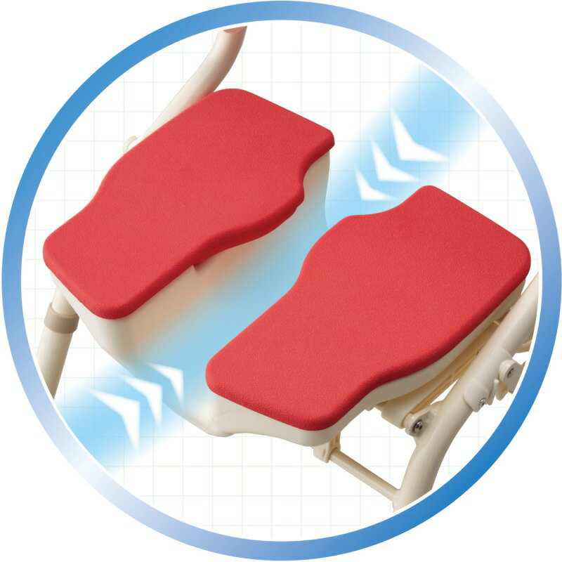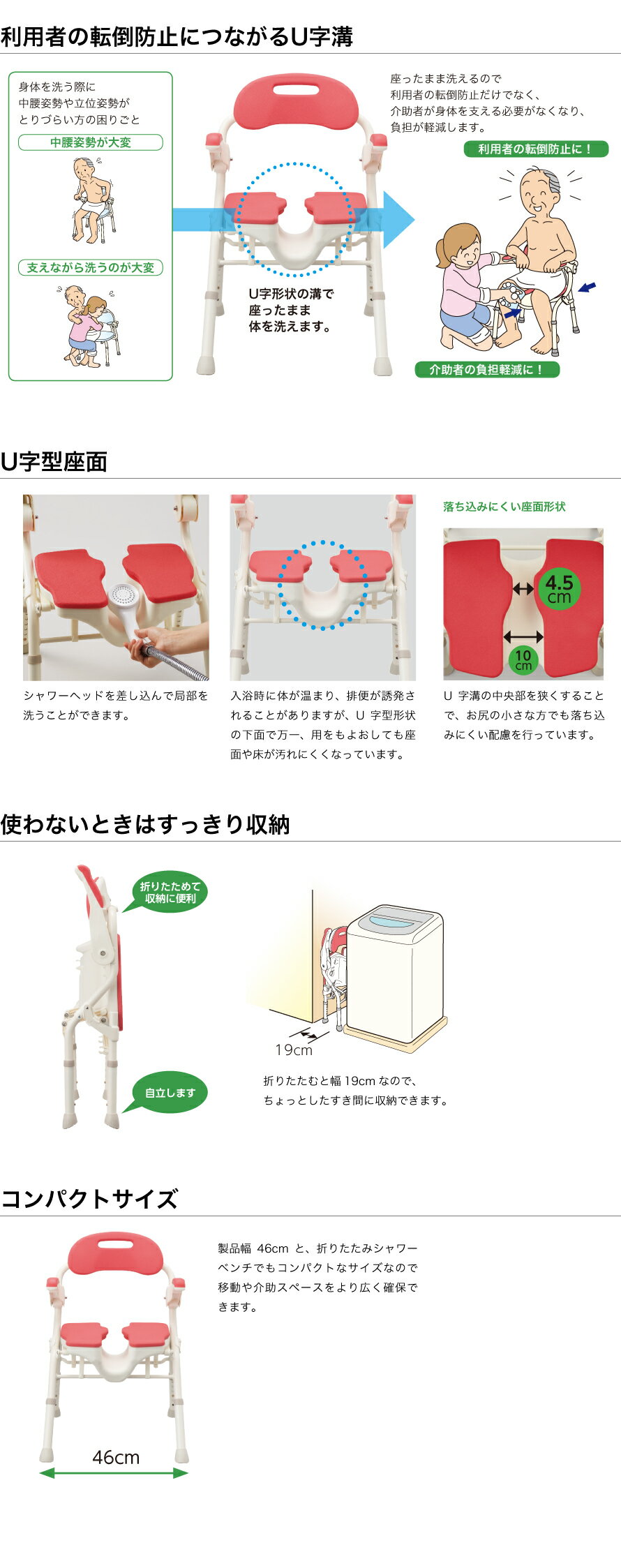 === 商品説明 === ●サイズ/幅46×奥行45〜53×高さ64〜74cm 折りたたみ時:奥行19×高さ78〜89cm、座面:幅36×奥行30cm 座面高:33〜43cm(6段階/2cm)、U字溝:幅狭部4.5cm・幅広部(前)9・(後)10cm ●重さ/4.1kg ●材質/ポリエチレン、ポリプロピレン、エラストマー樹脂、EVA樹脂、アルミ、合成ゴム ●最大使用者体重/100kg ●標準機能/折りたたみ、ひじ掛けはね上げ、ソフト座面 ●SIAA防カビ加工 ●完成品安寿折りたたみシャワーベンチHPフィット レッド ●座ったままお尻が洗える、U字溝座面のシャワーベンチ。介助する人の負担を軽減します。 ●U字溝の中央部を狭くすることで、お尻の小さな方でも落ち込みにくい配慮を行っています。 ●U字型座面なのでシャワーヘッドを差し込んで局部を洗うことができます。 ●折りたたみでスッキリ収納できます。