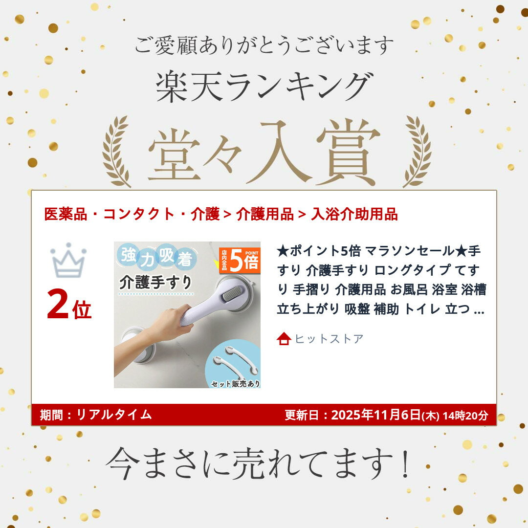 〇ロングタイプになってリニューアル!〇大人気の立ち上がりサポート用手すりがロングタイプになって新登場!掴める部分が増え、持ち手が滑りにくいように改良されたのでより使いやすくなりました。腰痛や怪我、妊娠やご高齢などの理由で立ち上がりが困難な方におすすめの商品です。【強力吸着】分厚く強力な吸盤でしっかりホールド。ロッククラッチ式でしっかり壁に密着するので安心して掴まれます。【簡単取り付け】壁に穴を開けたり工事の必要がなく吸盤で簡単に取り付け可能です。1.壁の汚れや水気を拭き取る→2.脱着状態にして壁に押し当てる→3.吸着状態にして取り付け完了※詳しい方法は画像をご確認ください※取り付け後は必ずしっかり固定できていることを確認して使用してください。【取り付け可能場所について】一般的に吸盤が吸着可能な壁に取り付け可能です。(ガラス・タイル・金属・アクリルなど)凹凸がありザラザラとした壁や、吸盤の直径より小さいタイル、カーブしている壁などは取り付け不可ですのでご確認ください。※日本語取扱説明書、撮影用小物類などは付属しておりません。※簡易包装でのお届けとなります。※モニターにより色合いが若干違いが生じる場合がございます。※デザインは入荷時期により若干変化する場合がございます※海外製造品のため、多少の匂い軽微な傷や汚れ、個体差等ある場合がございます。※商品の使用により生じた如何なる損害・被害も弊社では一切の責任を負いかねますので予めご了承ください。※発送方法について:お届け先、個数によって配送情報に記載の配送業者とは異なる場合がございます。日本郵便、佐川急便、またはセイノーエクスプレス(大型商品)でお届けいたします。なお、配送業者はお選びいただけませんので、ご了承ください。