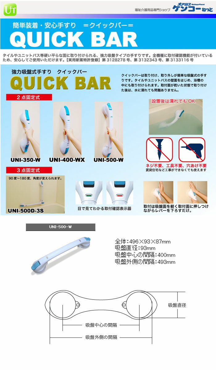 この商品と関連のある商品浴槽・浴室手すり クイックバー UNI-350-W浴槽・浴室手すり クイックバー UNI-400-WX浴槽・浴室手すり クイックバー UNI-500D-3S浴槽・浴室手すり クイックバー UNI-600D-3S浴槽・浴室手すり クイックバー UNI-500-W浴槽・浴室手すり クイックバー UNI-500-W・簡単装着・安心手すり「クイックバー」。・取付面が乾いた状態での取り付けなら、浴槽内でもOK。・吸盤が確実に吸着しているか確認できる取付確認機能付。(赤から緑に変われば使用可能)・取付は吸盤面を軽く取付面に押しつけながらレバーを下ろすだけ。・賃貸住宅など工事ができなくても使えます。※ネジ不要、工具不要、穴あけ不要【取り付けについて】FRPやアクリル板などの荷重に耐えられる滑らかな平面に取り付けられます。凹凸やざらつき等を避け、ユニットバスの壁面や浴槽の内側等に取り付けて立ち上がりの補助としてご使用ください。タイルにも取り付けられますが、タイル自身の強度やタイル目地に吸盤がかからないことに注意してご使用ください。吸盤ですので空気を通すような壁面やクロス等の表面加工を施した壁面にはお取り付けできません。●サイズ/幅49.6×奥行9.3×高さ8.7cm、グリップ部:40cm●重さ/530g●材質/本体・レバー:ABS、吸盤:PVC●耐荷重/垂直:60kg・水平:40kg●生産国/中国※こちらの商品はメーカー(提携先)からの直送となります。欠品時には納期にお時間をいただく場合が ございますのでお手数ですが急ぎの場合はお問い合わせください。注文について注意事項メーカー(提携先)からの直送となります。稀ではございますが欠品時は変動する場合もございますので、正確な納期はご注文の確認メールにてご案内させていただきます。