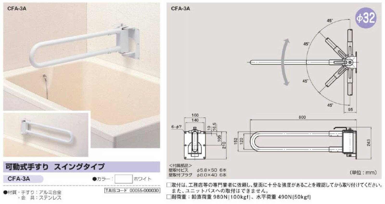 商品名 : φ32可動式手すり スイングタイプ CFA-3A H243×W800mm ホワイト