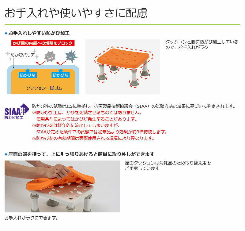 ・心地よく座れるソフトタイプ ・主に浴槽内イスとしてお使いの方におすすめです。 ・浴槽の高低差を補い、出入りをラクに。 ・浴槽に沈めて使うと、立ち座りもスムーズ。 ●サイズ/幅30×奥行24×高さ18・20・22・24・26cm(2cmピッチ5段階) ●重量/2.4kg ●座面サイズ/幅30×奥行24cm ●材質/座面クッション:EVA樹脂 本体フレーム、高さ調整脚:アルミニウム 固定レバー:ポリプロピレン 脚ゴム:エチレンプロピレンゴム ●カラー/オレンジ、ブルー、モカブラウン ●最大使用者体重/100kg ●メーカー品番/オレンジ:PN-L11526D ブルー:PN-L11526A モカブラウン:PN-L11526BR ●JANコード/オレンジ:4549077812117 ブルー:4549077812094 モカブラウン:4549077812100 ●メーカー名/パナソニック エイジフリーライフテック