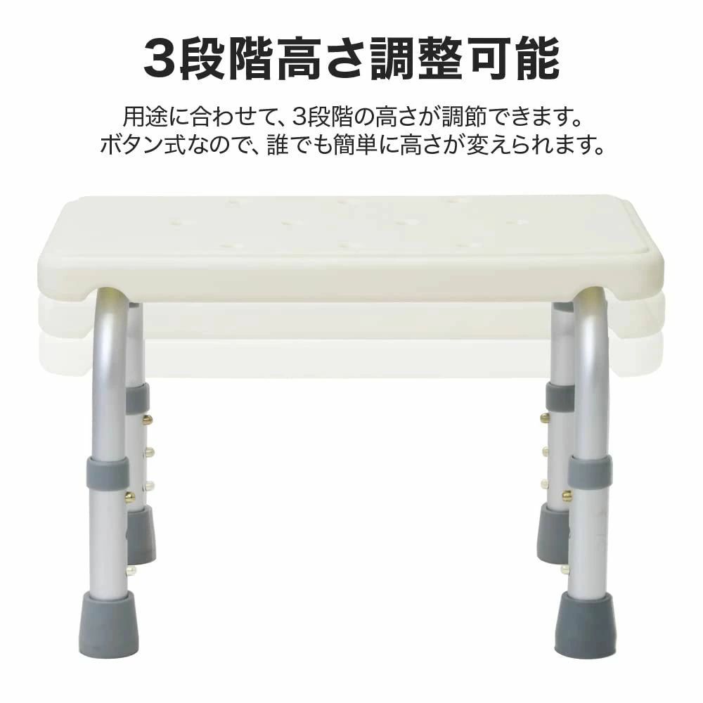 【浴槽の出入りをサポート】浴槽が高くて大変なときは浴槽外に置いて踏み台として、浴槽内では半身浴時のイスとしてお使いいただけます。【安心安全設計】脚はゴム製なので、滑りにくく表面が凸凹している床でも安定して置けます。耐荷重も100kgあるので、安心してお使いいただけます。【3段階高さ調整可能】用途に合わせて、3段階の高さが調節できます。ボタン式なので、誰でも簡単に高さが変えられます。【軽量で持ち運びラクラク】約1kgと軽量なので、移動するときやちょっとした位置替えのときに持ち運びがラクに行えます。サイズ(約)幅41×奥行22×高さ22〜27cm、重量(約)1kg、耐荷重(約)100kg、素材:表面/ABS、フレーム/アルミ合金、脚/ゴム製【浴槽の出入りをサポート】浴槽が高くて大変なときは浴槽外に置いて踏み台として、浴槽内では半身浴時のイスとしてお使いいただけます。【安心安全設計】脚はゴム製なので、滑りにくく表面が凸凹している床でも安定して置けます。表面は凹凸仕様。水抜け穴があるので水が溜りにくく、座ったり脚を置いても滑りにくくなっています。耐荷重も100kgあるので、安心してお使いいただけます。【3段階高さ調整可能】用途に合わせて、3段階の高さが調節できます。ボタン式なので、誰でも簡単に高さが変えられます。【軽量で持ち運びラクラク】約1kgと軽量なので、移動するときやちょっとした位置替えのときに持ち運びがラクに行えます。【商品詳細】サイズ(約):幅41×奥行22×高さ22〜27cm重量(約):1kg耐荷重(約):100kg素材:表面/ABS、フレーム/アルミ合金、脚/ゴム製浴槽ステップ 浴槽内椅子 浴槽台 お風
