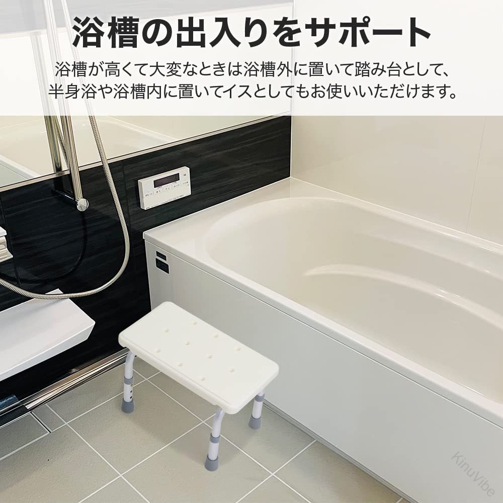 【浴槽の出入りをサポート】浴槽が高くて大変なときは浴槽外に置いて踏み台として、浴槽内では半身浴時のイスとしてお使いいただけます。【安心安全設計】脚はゴム製なので、滑りにくく表面が凸凹している床でも安定して置けます。耐荷重も100kgあるので、安心してお使いいただけます。【3段階高さ調整可能】用途に合わせて、3段階の高さが調節できます。ボタン式なので、誰でも簡単に高さが変えられます。【軽量で持ち運びラクラク】約1kgと軽量なので、移動するときやちょっとした位置替えのときに持ち運びがラクに行えます。サイズ(約)幅41×奥行22×高さ22〜27cm、重量(約)1kg、耐荷重(約)100kg、素材:表面/ABS、フレーム/アルミ合金、脚/ゴム製【浴槽の出入りをサポート】浴槽が高くて大変なときは浴槽外に置いて踏み台として、浴槽内では半身浴時のイスとしてお使いいただけます。【安心安全設計】脚はゴム製なので、滑りにくく表面が凸凹している床でも安定して置けます。表面は凹凸仕様。水抜け穴があるので水が溜りにくく、座ったり脚を置いても滑りにくくなっています。耐荷重も100kgあるので、安心してお使いいただけます。【3段階高さ調整可能】用途に合わせて、3段階の高さが調節できます。ボタン式なので、誰でも簡単に高さが変えられます。【軽量で持ち運びラクラク】約1kgと軽量なので、移動するときやちょっとした位置替えのときに持ち運びがラクに行えます。【商品詳細】サイズ(約):幅41×奥行22×高さ22〜27cm重量(約):1kg耐荷重(約):100kg素材:表面/ABS、フレーム/アルミ合金、脚/ゴム製 指定された配送時間は承っておりません。【KinuVibe】