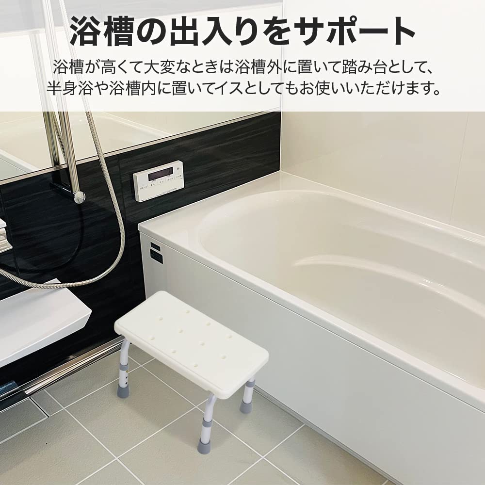 【浴槽の出入りをサポート】浴槽が高くて大変なときは浴槽外に置いて踏み台として、浴槽内では半身浴時のイスとしてお使いいただけます。 【安心安全設計】脚はゴム製なので、滑りにくく表面が凸凹している床でも安定して置けます。耐荷重も100kgあるので、安心してお使いいただけます。 【3段階高さ調整可能】用途に合わせて、3段階の高さが調節できます。ボタン式なので、誰でも簡単に高さが変えられます。 【軽量で持ち運びラクラク】約1kgと軽量なので、移動するときやちょっとした位置替えのときに持ち運びがラクに行えます。 サイズ(約)幅41×奥行22×高さ22〜27cm、重量(約)1kg、耐荷重(約)100kg、素材:表面/ABS、フレーム/アルミ合金、脚/ゴム製 【浴槽の出入りをサポート】 浴槽が高くて大変なときは浴槽外に置いて踏み台として、浴槽内では半身浴時のイスとしてお使いいただけます。 【安心安全設計】 脚はゴム製なので、滑りにくく表面が凸凹している床でも安定して置けます。 表面は凹凸仕様。水抜け穴があるので水が溜りにくく、座ったり脚を置いても滑りにくくなっています。 耐荷重も100kgあるので、安心してお使いいただけます。 【3段階高さ調整可能】 用途に合わせて、3段階の高さが調節できます。 ボタン式なので、誰でも簡単に高さが変えられます。 【軽量で持ち運びラクラク】 約1kgと軽量なので、移動するときやちょっとした位置替えのときに持ち運びがラクに行えます。 【商品詳細】 サイズ(約):幅41×奥行22×高さ22〜27cm 重量(約):1kg 耐荷重(約):100kg 素材:表面/ABS、フレーム/アルミ合金、脚/ゴム製