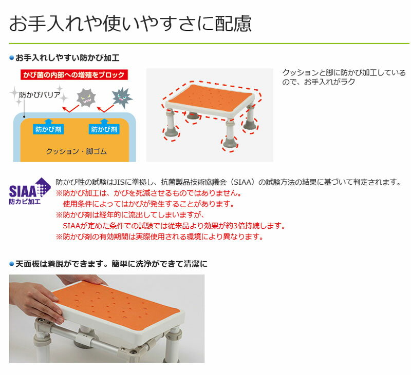 ※防カビ加工は、カビを死滅させるものではありません。使用条件によってはカビが発生することがあります。 ※防カビ剤は経年的に流出してしまいますが、SIAAが定めた条件での試験では従来品より効果が約3倍持続します。 ※防カビ剤の有効期間は実際使用される環境により異なります。 ・やわらかクッションと脚ゴムに防カビ加工、ユクリアシリーズ。 ・カビ菌の内部への増殖をブロック。 ・防カビ性の試験はJISに準拠し、抗菌製品技術協議会(SIAA)の試験方法の結果に基づいて判定されます。 ・持ち運びしやすい軽量タイプ ・幅広高さ調整が使いやすい! ・状態変化にあわせられる幅広高さ調整 ・立ち上がり状態が変化しても、調整対応が可能 大腿骨頸部骨折などで人工股関節術後は脱臼回避のために座面を高くします。 ・簡単操作で5段階の調整が可能 ・安心のミニ吸盤仕様 ・フレームはやさしいパールホワイト色 ●サイズ/ 幅32.5×奥行26.5×高さ12〜20cm 天板:幅30×奥行24cm ●重さ/2kg ●材質/ 本体フレーム:アルミ 座面天面板:ポリプロピレン(硬質部)・エラストマー(軟質部) 脚ストッパー:ポリプロピレン・ステンレス 脚ゴム:エチレンプロピレンゴム ●最大使用者体重/100kg ●生産国/中国 ●脚ゴム/ミニ吸盤タイプ ●カラー/オレンジ、ブルー、モカブラウン ●メーカー品番/ オレンジ:PN-L11720D ブルー:PN-L11720A モカブラウン:PN-L11720BR ●JANコード/ オレンジ:4549077812209 ブルー:4549077812186 モカブラウン:4549077812193 ●メーカー名/パナソニック エイジフリー