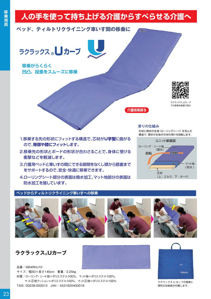 商品の仕様 ●サイズ/幅50×長さ140cm ●重さ/2.25kg ●材質/ローリング・シート地・マット地・収納袋:ポリエステル100%、芯材上部(エルク):複合繊維(ポリエステル)100%、芯材下部(ボード):ポリプロピレン100% 商品の説明 ・移乗がらくらく。凹凸、段差をスムーズに移乗。 ・移乗する先の形状にフィットする構造で、芯材がU字型に曲がるので、臀部や膝にフィットします。 ・移乗先の形状とボードの形状が合わさることで、身体に受ける衝撃などを軽減します。 ・介護用ベッドと車いすの間にできる隙間をなくし頭から膝裏までをサポートするので、安全・快適に移乗できます。 ・ローリングシート部分の表面は撥水加工、マット地部分の表面は防水加工を施しています。 ※マットレスとベッドの側板の隙間程度であれば、乗り越え可能です。本品を橋渡し状態にして体重を支えることはできませんのでご注意ください。
