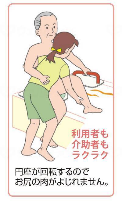 サイズ・重量 重量3100g ○回り過ぎない ・お尻の肉がよじれない 利用者・介助者ともに楽 ・座面(EVA材)は暖か クッション性、安定性 ○丸み形状で痛くない ・本体エッジは丸み形状 背中にあたっても良好 ・グリップのほか、本体端を握って体幹安定もできます ○100kg 3万回試験で無破損 多くの方がお使いになる施設の個浴でもOK! ○上から簡単設置 ・ストッパー孔通じてネジを手で留める ・ストッパーを浴槽内に密着、上からコイン締め ・座面の矢尻状ピンを孔に押し込み、設置完了! ○裏側の工夫 ・補強板 ・水抜き孔 ・滑り止めゴム 四隅に配置 ・ストッパー溝 滑りにくい凹凸形状 ・一体型ストッパー すっぽ抜けない密着部 ○着座入浴で転倒・骨折リスク低減! ○回転座面でラクラク ○デモ品ご用意 ○仕様 ・浴槽外寸:72cm〜 ※目安値 ・浴槽内寸:45〜66cm ※目安値 材質・原材料 <材質> ○本体:PP(グリップ含む) ○座面:EVA発泡体 ○回転機構:樹脂、ステンレススチール 規格詳細 長・幅:74cm×36cm 座径・厚:28cm×6cm(厚:浴槽−座面上) グリップ:23×10×2.5cm(幅×高×径) 使用方法 <使用方法> 回転座面があるから、身体の向きを変える時にお尻の肉がよじれない。利用者も介助者も楽。 ○自力で入る ・回転座面中央に座って片足ずつ浴槽に入れる(健側→患側) ・静かに浴槽内につかる ○自力で出る ・静かに回転座面に座る ・片足ずつ浴槽から出す ○介助で入る ・回転座面中央に座ってもらう(できればグリップを持つ) ・肩・背中を支えながら片足ずつ浴槽に入れる ・体幹を支え、静かに浴槽内につかる。 ※出る時は、反対の手順で行います。