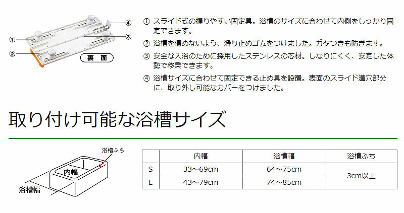 ・外側にも留め具をつけ、二重のずり落ちを防止します。 ・浴槽にしっかり固定できるのでスムーズな移乗が可能。 ボードの上に座れるので安心して入浴できます。 ・外側にも留め具をつけ、二重のずり落ちを防止します。 ・スライド式の握りやすい固定具、浴槽のサイズに合わせて内側にしっかり固定できます。 ・浴槽を傷めないよう、滑り止めゴムをつけました。 ガタつきも防ぎます。 ・安全な入浴のために採用したステンレスの芯材。 しなりにくく、安定した体勢で移乗できます。 ・浴槽サイズに合わせて固定できる「スライド式固定具」を設置、 表面のスライド溝穴部分に、取り外し可能なカバーをつけました。 ※ハンドルは取り付けとなります。 ●サイズ/ 幅72×奥行32×厚さ2.2cm 手すり:直径3×高さ15cm ●重さ/約3.5kg ●材質/ 本体・固定具・ハンドル芯材:ポリプロピレン 本体芯材:ステンレス鋼 ハンドル被覆材:オレフィン系エラストマー 固定具カバー・滑止め・止め金具カバー:エチレンプロピレンゴム ●取付可能浴槽サイズ/ 浴槽内寸33〜69cm 浴槽外寸64〜75cm 浴槽ふち3cm以上 ●最大使用者体重/100kg ●メーカー品番/VALSBDSOR ●JANコード/4547441353976 ●メーカー名/パナソニックエイジフリー
