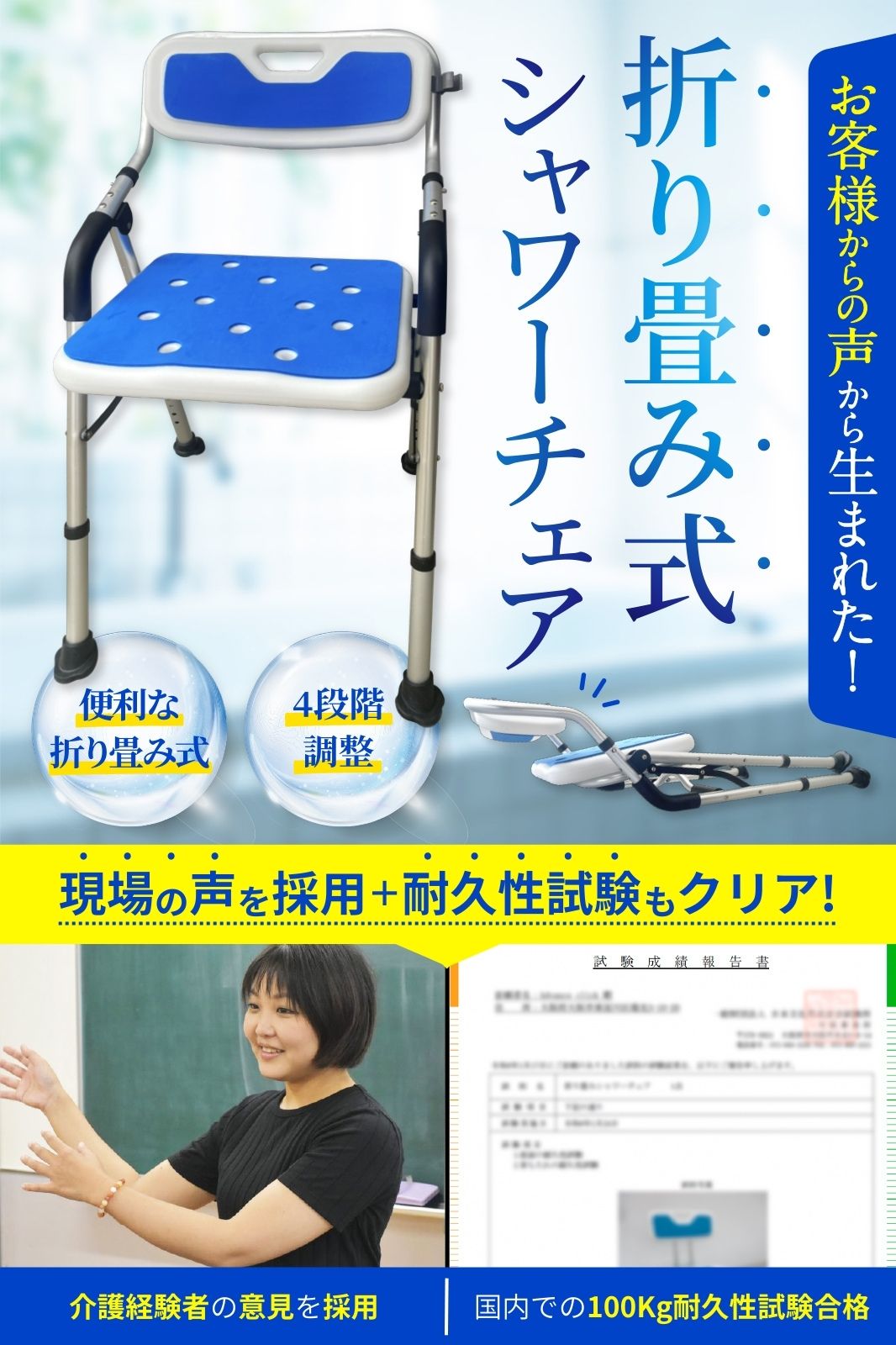 【現場の声を頂きました】 介護現場で活躍されている西村夏子さん。様々な福祉施設での介護経験がある介護のプロのお方におすすめいただきました。洗い場での介護が楽になる耐久性のあるシャワーチェアです。 【選べる3タイプ】お風呂の大きさ用途に合わせて、お選びいただけるよう3タイプご用意しました。背もたれ肘掛けタイプ・座面タイプ・背もたれタイプ 【6段階の高さ調節】 38~54cmに調整できる6段階の高さ調節があるので、体型に合わせたサイズで安心して使用できます。 【第三者機関での耐荷重検査実施済み】信頼のおける日本の第三者機関での耐荷重検査実施済み。試験内容9500N連続12500回毎分30~40回実施。日本の検査機関での100Kg耐久性試験合格。他のどこよりも安心して使用できます。 【転倒防止・安心お風呂ライフへ】高齢者が安心して入れるお風呂ライフへ。足先がゴム製ですので、転倒防止すべり止め効果抜群で安心して利用できます。座面の両側には手すりがあるので、浴室での転倒の危険からシャワーチェアがご家族を守ります。こんな商品お探しの方におすすめです。浴室 椅子 風呂椅子 介護用 入浴介護 立ち上がり補助 転倒防止 【清潔性と組立簡単】 座面には穴があいているので水が溜まる心配がなく、手入れがしやすいため清潔に使えます。 カンタン組み立て日本語説明書が同封されているので、工具が不要で10分~15分でどなたでも組み立てできます。 パイプに付けて使用するシャワーフック付き。 【30日間の返金保証】安心の日本ブランド。30日間の返金保証付き。万が一商品がお気に召されない場合日本人スタッフが返金または交換対応させていただきます。是非お試しください。 椅子にお座りの状態で、本製品を動かすことは絶対におやめください。 足部分がゆがみ、故障の原因となります。 こちらの使用方法による故障は初期不良には該当いたしませんため、保証の対象外となります。 何卒ご理解のほどよろしくお願い申し上げます。 ■365日受注・発送業務を行っておりますが、土日祝はサポート業務(商品に関するお問い合わせ・住所変更・日時変更・キャンセル等)をお休みとさせていただきます。 この間、受注・発送業務は行っておりますが、サポート業務に関するお問い合わせのご返答ができません。