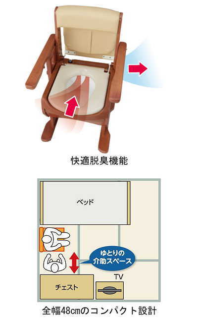 ・住環境・症状・体格・そして機能で選べる!あなたにぴったりのトイレが見つかります。 ・尿こぼれ・木部への浸透を防ぐ!すべての便座が長穴形状でなので尿こぼれを防ぎます。尿のこぼれガード付き。 ・汚れやすい部分はプラスチックに。尿がついても染み込まずに拭き取れます。 ・省スペースに特化したコンパクトタイプ。 ・コンパクトで、ゆったり座れるアーチ型ひじ掛け。 ・排泄時、後始末の動作をゆったり行えます。●サイズ/幅48×奥行56×高さ73〜85cm、座面:幅36×奥行43cm、穴部:幅19×奥行31cm、便座高:33〜45cm(5段階/3cm)、ひじ掛け内寸:40cm、ひじ掛け高:18〜27cm(4段階/3cm) ●重さ/約15.3kg ●材質/天然木(ラバーウッド)、ウレタン塗装、合成皮革(PVC)、ポリプロピレン、発泡EVA樹脂 ●バケツ容量/約9L ●最大使用者体重/100kg ●標準機能/ひじ掛け高さ調整、暖房便座、キャスター付、オイルダンパー、防汚トレイ、脱臭機能 ●完成品・住環境・症状・体格・そして機能で選べる!あなたにぴったりのトイレが見つかります。 ・尿こぼれ・木部への浸透を防ぐ!すべての便座が長穴形状でなので尿こぼれを防ぎます。尿のこぼれガード付き。 ・汚れやすい部分はプラスチックに。尿がついても染み込まずに拭き取れます。 ・省スペースに特化したコンパクトタイプ。 ・コンパクトで、ゆったり座れるアーチ型ひじ掛け。 ・排泄時、後始末の動作をゆったり行えます。●サイズ/幅48×奥行56×高さ73〜85cm、座面:幅36×奥行43cm、穴部:幅19×奥行31cm、便座高:33〜45cm(5段階/3cm)、ひじ掛け内寸:40cm、ひじ掛け高:18〜27cm(4段階/3cm) ●重さ/約15.3kg ●材質/天然木(ラバーウッド)、ウレタン塗装、合成皮革(PVC)、ポリプロピレン、発泡EVA樹脂 ●バケツ容量/約9L ●最大使用者体重/100kg ●標準機能/ひじ掛け高さ調整、暖房便座、キャスター付、オイルダンパー、防汚トレイ、脱臭機能 ●完成品