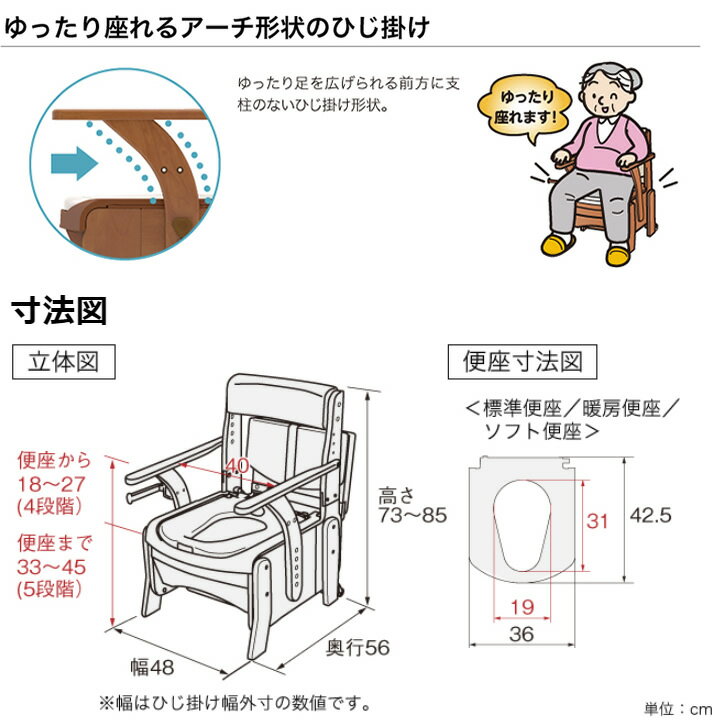 お手入れしやすくなった家具調トイレ汚れやすい部分をプラスチックにして掃除がしやすくなりました。汚れやすい部分はプラスチックで覆われ、尿がついてもきれいに拭き取れます。受け板部は前方に段差があり、こぼれた尿が木部につきにくい構造になっています。本体性能○キャスター標準装備ちょっとした移動に便利なキャスター付き。○シームレス型折れ座面金属製の蝶番を使用していないのでサビの心配がありません。○尿の飛び散りを防ぐ「こぼれガード」【こぼれガード】付きなので、前方への尿の飛び散り、こぼれを防ぐことが出来ます。新型節水バケツを採用。1Lの水で従来通り汚物をカバー。便座穴にもフィットするバケツ蓋。閉まっているのが判りやすい便座とバケツ蓋のコントラストデザイン省スペースに特化したコンパクトタイプコンパクトで、ゆったり座れるアーチ型ひじ掛け排泄時、後始末の動作をゆったり行えます。最大使用者体重:100kg組立完成品バケツ容量:約9L<材質>構造部材:天然木(ラバーウッド)/表面加工・ウレタン塗装張り材:合成皮革(塩化ビニル樹脂)クッション材:ウレタンフォーム受け板・汚水受け・バケツ:ポリプロピレン便座:発泡EVA樹脂(抗菌加工)便座ベース板:ポリプロピレン仕様表詳細サイズ:幅48×奥行56×高さ73〜85cm重量:約14kg規格1台