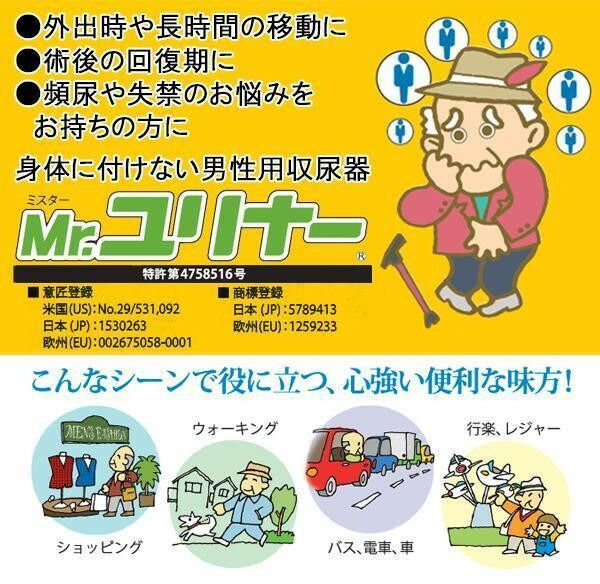 <<ご注意下さい>>こちらの商品はメーカーよりお客様へ直接お届けの品になります。 当店での在庫はしておりません。在庫の有無はメーカー在庫のみになりますので、急な欠品や急に廃盤になる可能性がございます。こちらの商品の配送について○北海道・沖縄・離島につきましては、配送不可となりますので予めご了承お願いします。こちらの商品の包装(ラッピング)について○上記の理由(メーカーより直送)により包装はできませんので予めご了承お願いします。こちらの商品の不具合について○お届けしましたこちらの商品に不具合があった場合、商品到着日より1週間以内に当店にご連絡ください。メーカーが直接対応させて頂きます。○お客様がご自身で修理された場合、費用の負担は致しかねますので予めご了承下さい。トイレが心配な男性の強い味方!!体に付けないタイプの収尿器。ズボンのファスナーの開口部から「Mr.ユリナー」を入れて、2点のクリップを衣服に固定するだけで装着完了。服を着たままわずかな手順で、ご自身で簡単に脱着することができます。サイズ:個装サイズ:20.0×36.0×6.0cm重量:個装重量:393g素材・材質:レシーバー:シリコンチューブ/外チューブ:ポリ塩化ビニル(PVC)、内チューブ:シリコンボトル:ポリエチレン(PE)キャップ:ポリアセタール(POM)クリップ/本体:ポリスチレン(PS)、バネ:ステンレス(SUS304)セット内容:本体、250mlボトル、350mlボトル、取扱説明書、保証書(6ヶ月)生産国:日本
