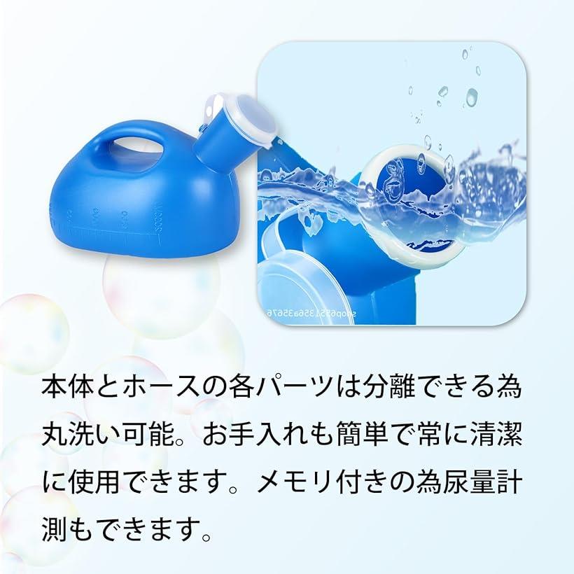 「使いやすい蛇腹ホース付き」 1.6mの蛇腹ホースが付属しているため、使用時の操作がしやすく、様々な体勢でも快適に使用できます。ポイントです。「大容量で安心」 2000mLの大容量設計により、頻繁な交換が不要です。朝と夜2回程度の取り替えで十分ですので、夜間の安心感がございます。「清潔を優先して分解可能設計」 チューブ、蓋、ボトルが分解可能で、隅々までしっかり洗えます。お手入れが簡単で、清潔に確保できます。「持ち運びに便利なデザイン」持ち歩きやすいので 、満杯でも簡単に持ち運べる事が可能です。旅行や外出にも重宝するアイテムです。「可能なカスタマイズチューブ」 ホースはお好みに合わせて長さを調節可能。必要に応じてそのまま使えるので、用途に応じたカスタマイズが可能です。※ 他ネットショップでも併売しているため、ご注文後に在庫切れとなる場合があります。予めご了承ください。※ 品薄または希少等の理由により、参考価格よりも高い価格で販売されている場合があります。ご注文の際には必ず販売価格をご確認ください。※ 沖縄県、離島または一部地域の場合、別途送料の負担をお願いする場合があります。予めご了承ください。※ お使いのモニタにより写真の色が実際の商品の色と異なる場合や、イメージに差異が生じることがあります。予めご了承ください。※ 商品の詳細(カラー・数量・サイズ 等)については、ページ内の商品説明をご確認のうえ、ご注文ください。※ モバイル版・スマホ版ページでは、お使いの端末によっては一部の情報が表示されないことがあります。すべての記載情報をご確認するには、PC版ページをご覧ください。商品名:1.6mホース付き排尿ボトル 容量:2000mL カラー:ブルー サイズ:画像参照 材質:プラスチック