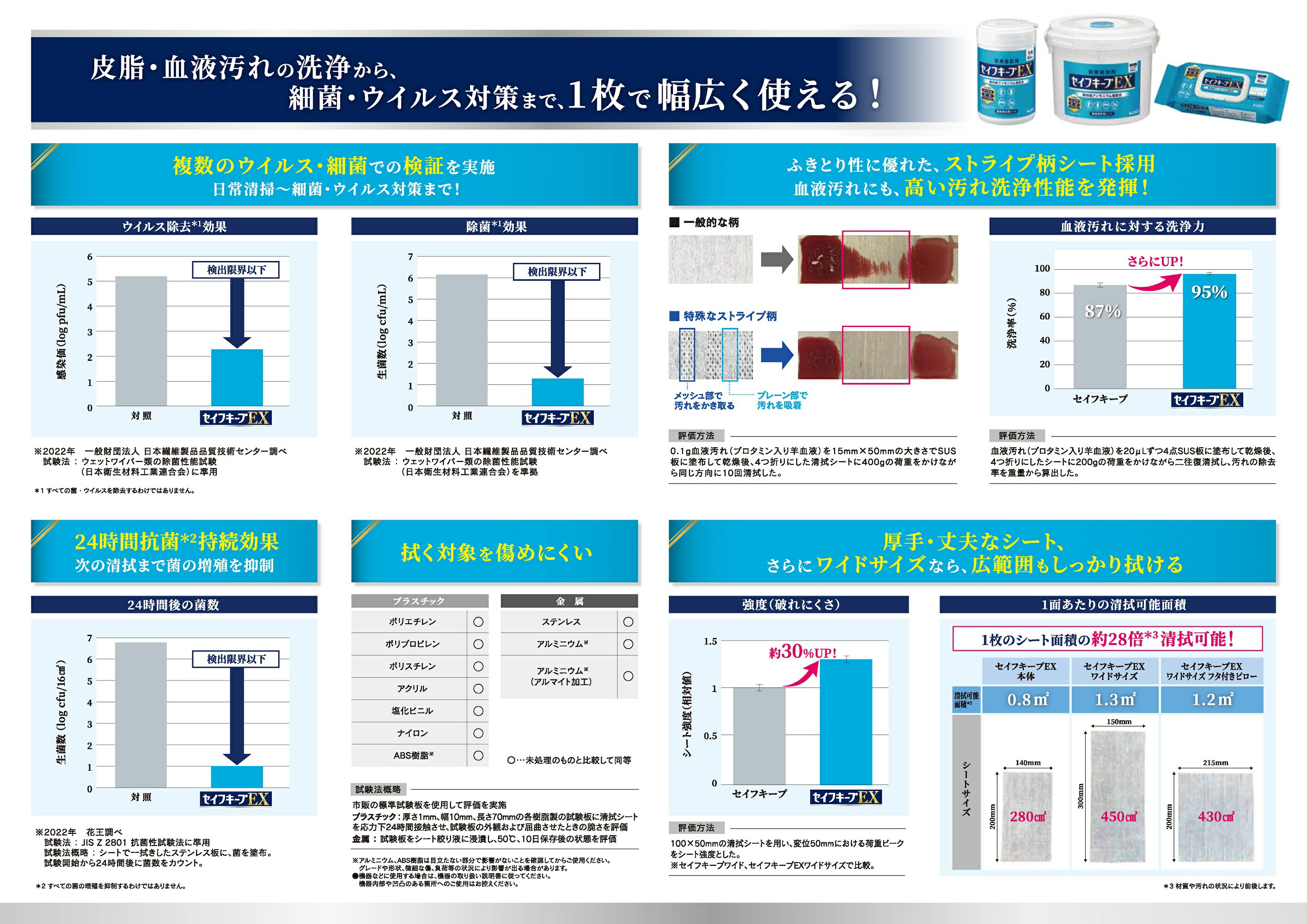 【花王 製品仕様書より抜粋】 【特長1】優れた除菌性能 除菌成分、ジデシルジメチルアンモニウムクロライド(第4級アンモニウム塩)の働きで優れた効果を発揮し、効果が持続します。 【特長2】高い洗浄力 ・洗浄成分、AG(アルキルグルコシド)AAO(アルキルアミンオキシド)の働きで、アルコール含浸ペーパーでは落としきれない手指の皮脂汚れから体液・血液汚れまでしっかり落とします。 【特長3】低い基材損傷性 ・素材にやさしい洗浄成分を配合、プラスチックを傷めません。 ・非塩素系なので臭わず、金属を傷めません(銅など一部金属を除く) 【特長4】優れた拭取り性 ・アルコール分を含まないので、ゆっくり乾き、広い面積を拭く事が出来ます。手が頻繁に触れる環境表面や体液・血液汚れの除菌と洗浄が手軽にできるペーパータイプ。