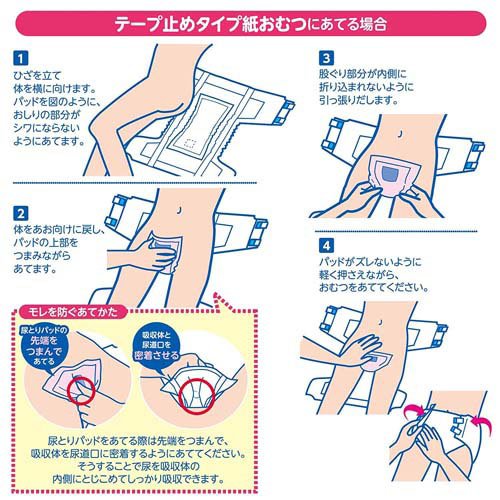 お店TOP>介護>おむつ・失禁対策・トイレ用品>尿とりパッド>尿とりパッド女性用>サルバ 尿とりパッドスーパー 女性用 (60枚入)【サルバ 尿とりパッドスーパー 女性用の商品詳細】●パッドタイプ サイズ20×47cm●排尿量約2回分をしっかり吸収します。またテープ止めタイプやパンツタイプの紙おむつとの併用ができます。●pHコントロールパルプ採用により弱酸性・抗菌・消臭。●「吸収ポリマー」がアンモニアの臭いを抑えます。●ズレ防止テープの採用でおむつにしっかり固定。動いてもズレません。●医療費控除対象品【使用方法】★下着にあてる場合・下着をパッドがあてやすい位置まで下げます。・尿取りパッドスーパーのズレ防止テープをはがし、ずれないよう下着に固定します。・下着を引き上げ、パッドがズレないよう、テープ部をしっかり固定します。★テープ止めタイプ紙おむつに当てる場合・ひざを立て体を横に向けます。・パッドを図のように、お尻の部分がシワにならないようにあてます。・体を仰向けに戻し、パッドの上部をつまみながらあてます。(尿取りパッドをあてる際は先端をつまんで吸収体を尿道口に密着するように当ててください。そうすることで尿を吸収体の内側にとじこめてしっかり吸収できます)・股ぐり部分が内側に取り込まれないように引っ張り出します。・パッドがズレないように軽く押さえながらおむつをあててください。★パンツタイプ紙おむつにあてる場合・尿取りパッドスーパーをパンツタイプの立体ギャザー内に収まるようにあてます・パンツを引き上げパッドがズレていないか、立体ギャザー内にしっかり収まっているか確認してください。【規格概要】・素材表面材:ポリオレフィン系不織布吸水材:綿状パルプ、高分子吸収剤、吸水紙防水材:ポリオレフィンフィルム止着材:剥離紙、スチレン系合成樹脂等伸縮材:ポリウレタン結合剤:スチレン系合成樹脂等【注意事項】★使用前の注意・肌着をおむつの中に入れないでください。・おむつが汚れていなくても使ったら毎日取り換えましょう。・洗濯はできません。・温度の高いところや水に濡れやすい場所には保管しないように気をつけてください。・肌に残った大便はキレイにふき取ってください。・お出かけの際は処理袋をご持参ください。・肌に合わない方は使用を中止してください。★使用上の注意・汚れた紙おむつは早く取り換えてください。・テープは直接お肌につけないでください。・誤って口に入れたりのどにつまらせることのないよう保管場所に注意し、使用後はすぐに処理してください。★使用後の処理・紙おむつに付着した大便はトイレに始末してください。・汚れた部分を内側にして丸め、不衛生にならないよう処理してください。・トイレに紙おむつを流さないでください。・使用後の紙おむつの破棄方法は、お住まいの地域のルールに従ってください。・外出時に使ったおむつは持ち帰りましょう。★保管上の注意・開封後は、ほこりや虫が入らぬよう衛生的に保管してください。【原産国】日本【ブランド】サルバ【発売元、製造元、輸入元又は販売元】白十字リニューアルに伴い、パッケージ・内容等予告なく変更する場合がございます。予めご了承ください。白十字171-8552 東京都豊島区高田3-23-120120-01-8910広告文責:楽天グループ株式会社電話:050-5577-5043[大人用紙おむつ 失禁用品/ブランド:サルバ/]