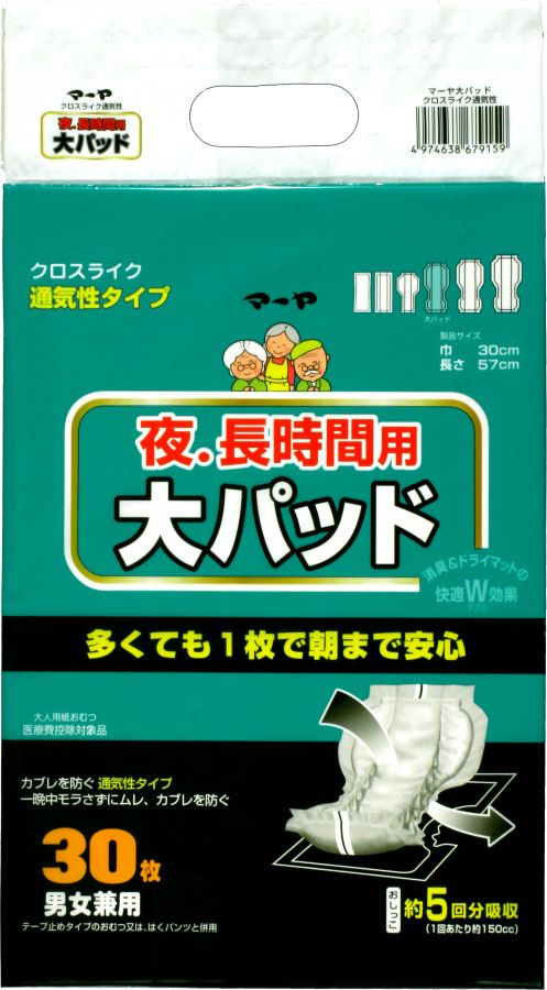 商品名 : マーヤ 夜長時間用 大パッド クロスライク 240枚入(30枚×8袋入) 30cm×57cm ひょうたん型 ワイド 5回分(750ml)吸収 布感覚通気性(透湿性)