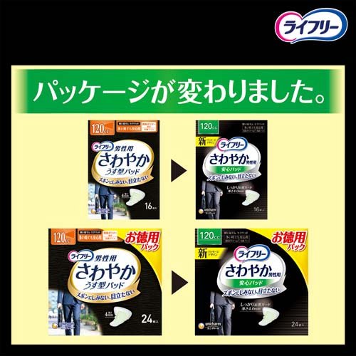 お店TOP>介護>おむつ・失禁対策・トイレ用品>軽失禁対策>尿もれ用シート・パッド 男性用>ライフリー さわやか男性用安心パッド120cc 男性用軽失禁パッド 26cm (24枚入*5袋セット)【ライフリー さわやか男性用安心パッド120cc 男性用軽失禁パッド 26cmの商品詳細】●男性専用の「ズボンにしみない、目立たない」尿もれケアパッド。●「前側ワイド形状」で、体の前側を幅広くカバー。●「ホールドギャザー」採用で、はみ出しをしっかりガード。【使用方法】1.幅広の方から個包装(はく離紙ごと)をはがす。2.幅広の方をおなか側にして、粘着面を下着に貼る。・ぴったりした下着にお使いください。・前開き部分が使用できなくなる場合があります。・トイレに流さないでください。【規格概要】(外装材)ポリエチレンフィルム(素材)表面材:ポリオレフィン・ポリエステル不織布/吸水材:綿状パルプ、吸水紙、高分子吸水材/防水材:ポリオレフィンフィルム/止着材:スチレン系エラストマー合成樹脂/伸縮材:ポリウレタン/結合材:スチレン系エラストマー合成樹脂(抗菌剤の種類)セチルピリジニウムクロリド(抗菌加工部位)ティッシュ【注意事項】・汚れたパッドは早くとりかえてください。・テープは直接お肌につけないでください。・誤って口に入れたり、のどにつまらせることのないよう、保管場所に注意し、使用後はすぐに処理してください。【原産国】日本【ブランド】ライフリー 軽度 男性【発売元、製造元、輸入元又は販売元】ユニ・チャーム※説明文は単品の内容です。商品に関するお電話でのお問合せは、下記までお願いいたします。受付時間9:30-17:00(月-金曜日、祝日除く)ベビー用品:0120-192-862生理用品:0120-423-001軽失禁・介護用品(ライフリー):0120-041-062生活用品(化粧パフ・一般ウェットティッシュ・お掃除用品など):0120-573-001衛生用品(マスク):0120-011-529ペットケア用品:0120-810-539リニューアルに伴い、パッケージ・内容等予告なく変更する場合がございます。予めご了承ください。・単品JAN:4903111526482ユニ・チャーム東京都港区三田3-5-19住友不動産三田ガーデンタワー広告文責:楽天グループ株式会社電話:050-5577-5042[大人用紙おむつ 失禁用品/ブランド:ライフリー 軽度 男性/]