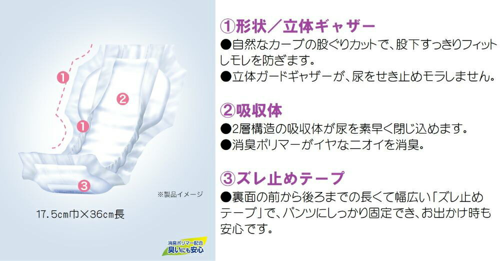 【入数】144枚/ケース(24枚×6袋入)【製品サイズ/形状】17.5cm巾×36cm長/ひょうたん型(股下すっきりカット)【個包装袋サイズ/重量】155mm高×225mm巾×110mm奥行/570g【梱包ケースサイズ/重量】335mm高×226mm巾×310mm奥行/3.9kg【素材】<表面材>ポリオレフィン不織布<吸収材>綿状パルプ/吸収紙/高分子吸収材<防水材>ポリオレフィンフィルム<止着材>ホットメルト粘着剤<伸縮材>ポリウレタン系<結合材>スチレン系エラストマーなど【吸収量目安】180ml【その他特徴】立体ギャザー/2層の吸収マット構造/裏面全体幅広粘着ズレ止めテープ