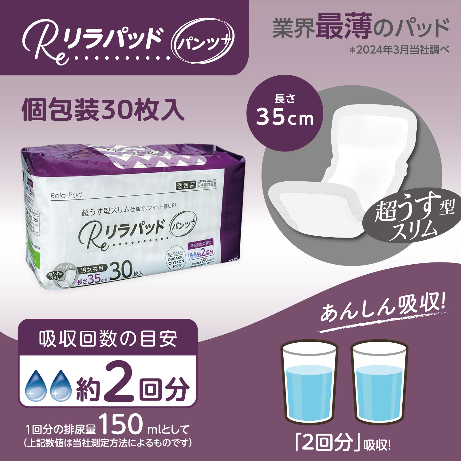 商品名 : リラパッド パンツ + (プラス) 大人用 尿取りパッド 薄型 オーガニックコットン 2回吸収 35cm 数量がえらべる30枚〜450枚 尿失禁 尿漏れ 紙おむつ 漏れ 災害 防災 緊急 トイレトレーニング ドライブ スポーツ アクティブ 登山 大人用紙おむつ オムツパット 尿漏れパッド 夜間