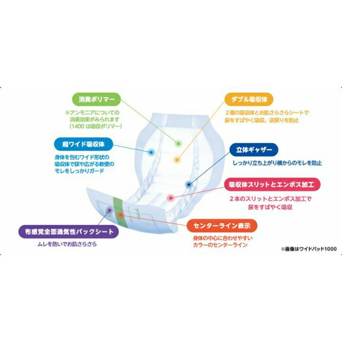 アクティ ワイドパッド1000 30枚×4袋(ケース販売)/日本製紙クレシア/送料無料 介護用オムツ/おむつ/尿とりパッド/男女兼用/ メーカー:日本製紙クレシア身体の中心に合わせやすいカラーのセンターライン。2層の吸収体とお肌サラサラシートで尿を素早く吸収、逆戻りを防止。立体ギャザーがしっかり立ち上がり、横からのモレをガード。消臭ポリマー。(アンモニアについて消臭効果が見られます)アクティ独自の吸収体エンボス加工で尿をすばやく吸収。超ワイド吸収体採用。身体をつつむワイド形状の吸収体で尿や広がる軟便のモレをしっかりガード。布感覚全面通気バックシートでムレを防いでお肌さらさら。 商品説明パッドサイズ:32×63cm入数:30枚入×4袋入吸収量の目安:約1650cc注意事項※商品パッケージや仕様は予告なく変更される場合がありますので予めご了承ください。※複数店舗で販売の為、表記している在庫と実在庫は異なる場合がございます。予めご了承下さい。※ケース販売分でも別の段ボールへ入れ替えて出荷する場合がございますので、メーカー梱包での配送をご希望の方はその旨のご連絡をお願い致します。※在庫は日々変動しており、予告なく欠品となる場合もございます。 2