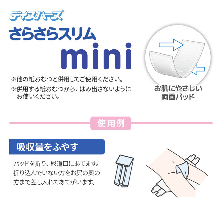 商品名 : 両面吸収パッド さらさらミニ 48枚 失禁対策 男女兼用 補助パッド 尿 便 モレ対策 介護用品 吸収量アップ 伝いモレ 背モレ 折る 丸める 重ねる うめる