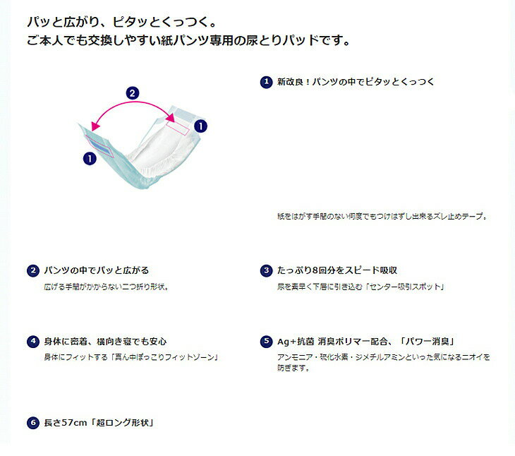 ※ケース(16枚×3袋)販売です。 ※別売りの「紙パンツ」と一緒に使います。紙パンツ専用の「尿とりパッド」です。 ※パッケージ・品番は予告なく変更する場合がございます。 ・一晩中ズレずに安心な紙パンツ専用の尿とりパッド。 ・ライフリー紙パンツ用パッド史上最長57cm安心サイズで、横向きでもモレずに一晩中あんしん、ぐっすり。 ・男女兼用 ●サイズ/幅18×長さ57cm ●吸水量目安/約1,200cc ●入数/16枚×3袋 ●日常生活動作レベル/1_一人で歩ける〜3_介助が必要 ●メーカー品番/54449 ●JANコード/4903111544493 ●メーカー名/ユニ・チャーム