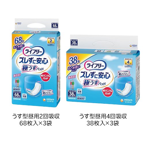 お店TOP>介護>おむつ・失禁対策・トイレ用品>尿とりパッド>尿とりパッド パンツ用>ライフリー ズレずに安心 紙パンツ専用尿とりパッド (3袋セット)【ライフリー ズレずに安心 紙パンツ専用尿とりパッドの商品詳細】●紙パンツの中にキレイに収まる長さ・幅専用形状なので、ぴったりフィットしモレ安心●前後のズレ止めテープが紙パンツにぴったりくっついて、上げ下げしてもズレない2025年10月9日 517294 517295 削除、621037 621044 追加2025年10月20日 570834 リニューアル2025年11月12日 621037 削除、621043 追加【規格概要】★うす型2回吸収 68枚入*3袋(素材)表面材:ポリオレフィン不織布/吸水材:綿状パルプ、吸水紙、高分子吸水材/防水材:ポリオレフィンフィルム/止着材:ポリオレフィン系合成樹脂/伸縮材:ポリウレタン/結合材:スチレン系エラストマー合成樹脂(外装材)ポリエチレン★うす型昼用4回吸収38枚入*3袋(素材)表面材:ポリオレフィン・ポリエステル不織布/吸水材:綿状パルプ、吸水紙、高分子吸水材/防水材:ポリオレフィンフィルム/止着材:ポリオレフィン系合成樹脂/伸縮材:ポリウレタン/結合材:スチレン系エラストマー合成樹脂(外装材)ポリエチレン★2回吸収 72枚入*3袋(素材)表面材:ポリオレフィン不織布/吸水材:綿状パルプ、吸水紙、高分子吸水材/防水材:ポリオレフィンフィルム/止着材:ポリオレフィン系合成樹脂/伸縮材:ポリウレタン/結合材:スチレン系エラストマー合成樹脂(外装材)ポリエチレン★3回吸収 42枚入*3袋(素材)表面材:ポリオレフィン不織布/吸水材:綿状パルプ、吸水紙、高分子吸水材/防水材:ポリオレフィンフィルム/止着材:ポリオレフィン系合成樹脂/伸縮材:ポリウレタン/結合材:スチレン系エラストマー合成樹脂(外装材)ポリエチレン【注意事項】・汚れたパッドは早くとりかえてください。・テープは直接お肌につけないでください。・誤って口に入れたり、のどにつまらせることのないよう、保管場所に注意し、使用後はすぐに処理してください。【原産国】日本【ブランド】ライフリー 中度インナー【発売元、製造元、輸入元又は販売元】ユニ・チャーム商品に関するお電話でのお問合せは、下記までお願いいたします。受付時間9:30-17:00(月-金曜日、祝日除く)ベビー用品:0120-192-862生理用品:0120-423-001軽失禁・介護用品(ライフリー):0120-041-062生活用品(化粧パフ・一般ウェットティッシュ・お掃除用品など):0120-573-001衛生用品(マスク):0120-011-529ペットケア用品:0120-810-539リニューアルに伴い、パッケージ・内容等予告なく変更する場合がございます。予めご了承ください。ユニ・チャーム東京都港区三田3-5-19住友不動産三田ガーデンタワー広告文責:楽天グループ株式会社電話:050-5577-5042[大人用紙おむつ 失禁用品/ブランド:ライフリー 中度インナー/]