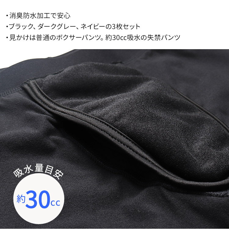 商品名 : 3枚組安心ボクサーパンツ 失禁パンツ尿漏れパンツ 吸水パンツ メンズ 男性用 下着 パンツ 中失禁 前開き 綿 コットン 消臭 防水 大きいサイズ 3枚セット旅行 ちょい漏れ バレない 抗菌消臭 介護 プレゼント 入院 入所 シニア