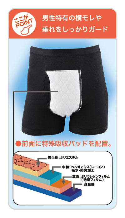 ●適応サイズ(ウエスト)/M:94〜104cm、L:76〜84cm、LL:84〜94cm ●材質/綿78%、ナイロン17%、ポリウレタン5% ●生産国/中国 ・見た目はスポーティーでカッコイイ普通のボクサーパンツ。3層の構造の吸水パットがついており、尿漏れを防いでくれます。