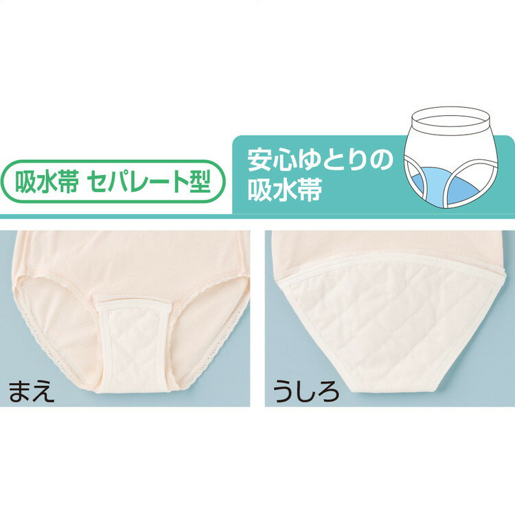 ●サイズ/(総丈)M:36cm、L:38cm、LL:41cm●適応サイズ目安/(対応ウエスト)M:64〜70cm・L:69〜77cm・LL:77〜85cm、(対応ヒップ)M:87〜95cm・L:92〜100cm・LL:97〜105cm●素材/本体:綿100%、(吸水帯)表:ポリエステル・中:不織布・裏:透湿防水ポリウレタン●吸水量/100cc●生産国/中国●洗濯機可●抗菌防臭+消臭加工●吸水帯セパレート型●にじみ出し防止●婦人用 ・頻繁に尿漏れをする方や長時間はき替えができない夜間も安心。何度も洗えて経済的なのもメリットです。紙オムツのゴワつきが気になる方にもおすすめです。・通常の下着と見た目もはき心地もほぼ同じです。・紙パンツやオムツに抵抗がある方も躊躇なくはけます。・尿意を実感しやすく、下着が濡れる感覚も体感できます。・オムツ交換といった介護に頼らず自立意識を支援します。・繰り返し洗っても使えるため経済的です。・夜間や多い尿漏れに備えてもっと安心したい方におすすめです。・下着と吸水帯の脚まわりが離れているタイプ。装着時はフィットし一体となっているのでズレません。・にじみ出し防止。吸水帯を防水シートで覆い、さらに身生地と吸水帯を防水布を介して縫合。・就寝中など量が心配な時におすすめ。・安心の5層構造。 【ケアファッション】