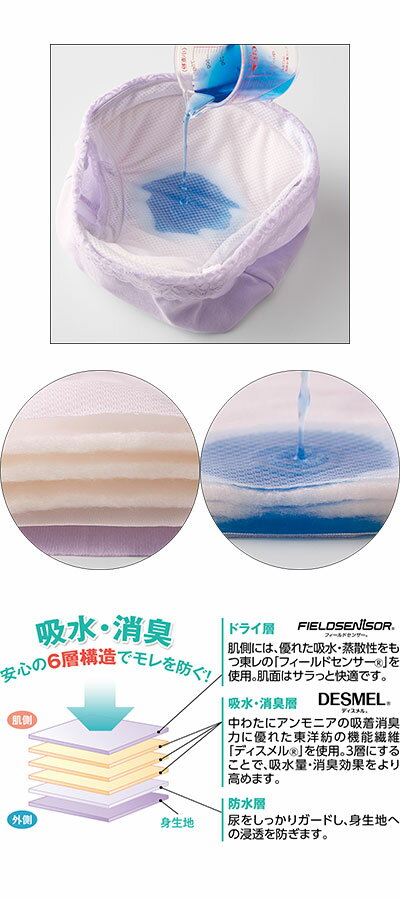 ●サイズ(ヒップ)/M:87〜95cm、L:92〜100cm、LL:97〜105cm●素材/身生地:綿100%、ウエスト・足口レース部:ナイロン・ポリウレタン、ドライ層:ポリエステル100%、吸水層:アクリル90%・合成繊維(ディスメル)10%、防水層:ポリエステル100%●吸水量目安/約100cc●生産国/日本●洗濯機可(40℃)●脱水機可●乾燥機不可●婦人用・吸水、消臭!機能性はもちろん!見た目もお洒落な日本製安心ショーツ。・マチ部分は6層構造で、たっぷり吸水!約100cc対応!・マチ部肌側には、優れた吸水・蒸散性をもつ東レの「フィールドセンサー」を使用し、サラッと快適です。・吸水部分は、東洋紡の「ディスメル」を3層使用。高い吸水性と優れた消臭力をもたらします。・3層構造の吸水層の両端を生地でくるむことで横漏れを軽減し、さらに安心!・深ばきで安心の履き心地。・身生地は肌に優しい綿100%。・ウエストはくい込みにくいお洒落なストレッチレース仕様。【セルヴァン】