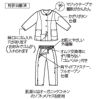 素材/外側:コットンプリント(綿100%)、内側:オーガニックコットン(メリヤス)(綿100%) ※オーガニック製品の特性上、繊維の中に綿花のカス(細かい茎)が混入している場合がございますが無害です。洗濯で落ちていきますのでご安心ください。使用に影響のない範囲で小さな汚れがある場合がございます。訳アリ品につきご理解の上、ご利用下さい。 洗濯/○ 脱水○ 乾燥機× サイズ表 サイズ 対象ヌード寸法(cm) 製品寸法(cm) 身長 胸囲 ウエスト 着丈 裄丈 ズボン丈 股下 S 140〜150 74〜84 60〜68 68 69 95 63 M 148〜158 80〜90 66〜76 71 73 99 66 L 156〜166 86〜96 74〜84 74 77 103 69 LL 156〜166 92〜102 82〜92 76 80 105 71お肌側にオーガニックコットンのソフトメリヤスを使っています。 裏地に使用しているソフトメリヤスは、お肌にとてもやさしい生地です。 二枚構造で、中間の空気の層が保温効果を高めます(特許出願済)。