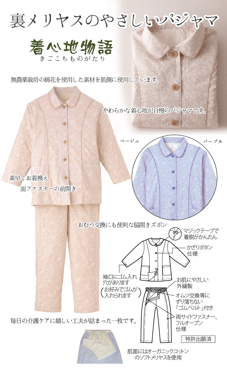 商品名 : オーガニック 介護 パジャマ (婦人用)(寝間着 ねまき 大人 女性 レディース 婦人 ミセス プレゼント ギフト 長袖 前開 裏付き 綿 花柄 ピンク パープル ルームウエア おしゃれ 可愛い カワイイ ゆったり おむつ オムツ 着替え 簡単 ファスナー 全開 脇開き 面ファスナー)