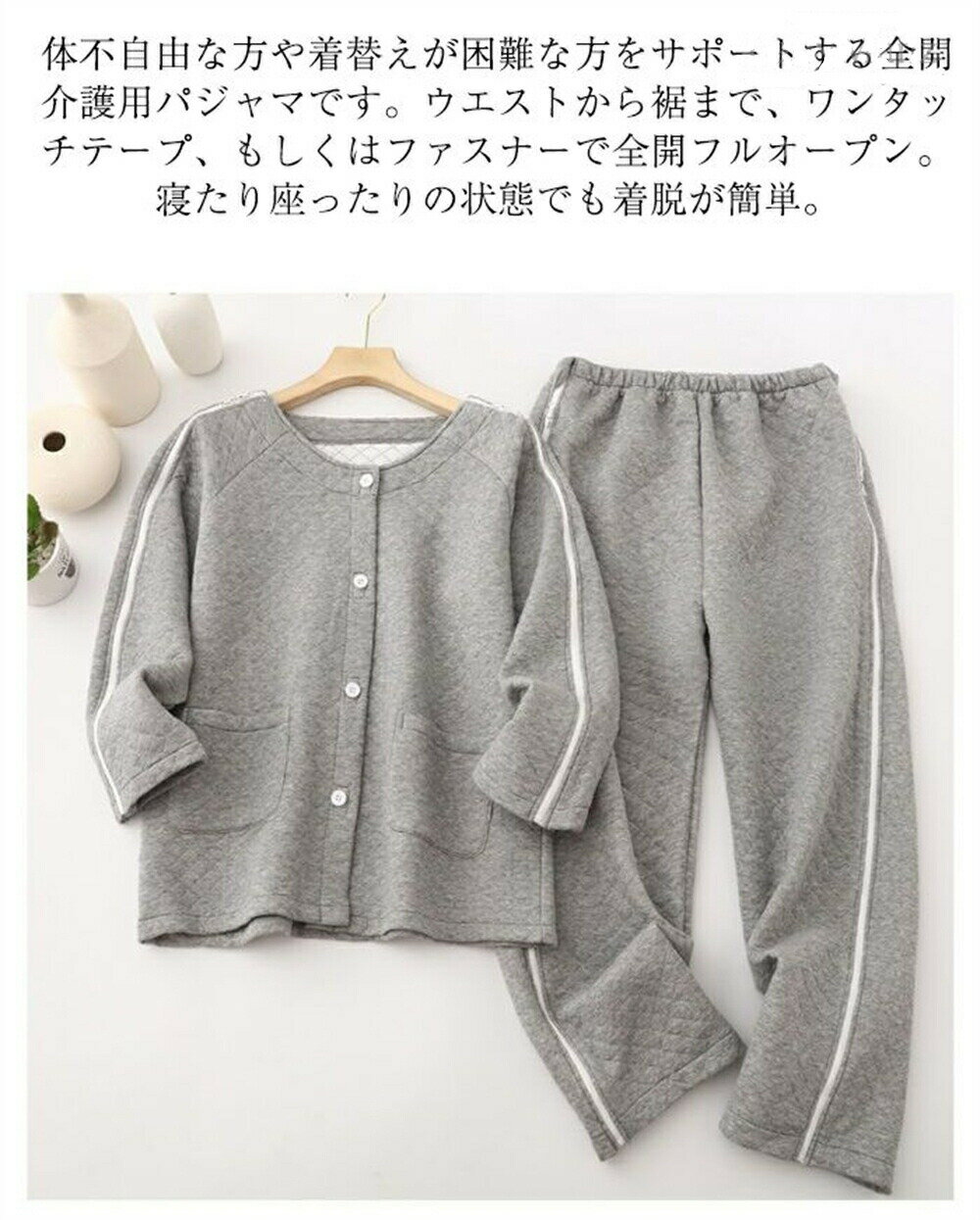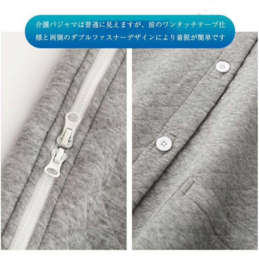 カラー グレー/ダークグレー/パープル/ブルー詳細着せる人、着せられる人に親切な介護服が登場します。独自片手でも着れる脱しやすい服です。両袖に両サイドファスナー付、襟ボタンのしたはマジックテープで、着せる方や着せられる方にも優しいデザインです。独自でも片手で着脱が楽にできます。全開にする場合では、ファスナーとマジックテープを全部取り外してください。ズボンの両側にファスナーが仕様となり、ウエストの部分から裾口まで簡単に開きます。中央部分、腹部のみ、裾部分のみ…など、好きなところだけ開け、チューブなど膝を出すこともできます。検診、介護時、着脱しやすく、もう診察や患部の塗り薬や張り薬を交換する際には上着を脱がせ、ズボンをおろす手間は心配いりません。片麻痺(片マヒ)/半身まひ、リウマチ、手足の不自由な方や骨折回復期にも適用します。素材綿コットンカラー グレー/ダークグレー/パープル/ブルー詳細着せる人、着せられる人に親切な介護服が登場します。独自片手でも着れる脱しやすい服です。両袖に両サイドファスナー付、襟ボタンのしたはマジックテープで、着せる方や着せられる方にも優しいデザインです。独自でも片手で着脱が楽にできます。全開にする場合では、ファスナーとマジックテープを全部取り外してください。ズボンの両側にファスナーが仕様となり、ウエストの部分から裾口まで簡単に開きます。中央部分、腹部のみ、裾部分のみ…など、好きなところだけ開け、チューブなど膝を出すこともできます。検診、介護時、着脱しやすく、もう診察や患部の塗り薬や張り薬を交換する際には上着を脱がせ、ズボンをおろす手間は心配いりません。片麻痺(片マヒ)/半身まひ、リウマチ、手足の不自由な方や骨折回復期にも適用します。素材綿コットン