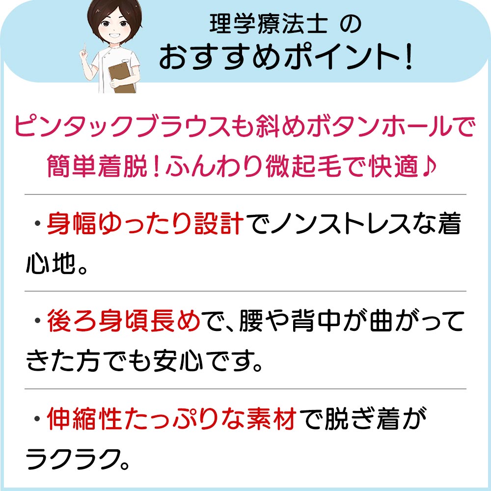 Item Information 簡単着脱 ★乾燥機対応ふんわり微起毛斜めボタンホールピンタックブラウス ベージュ/ローズ/パープル 対応サイズ 【S】バスト72-80cm 【M-L】バスト79-94cm 【LL】バスト93-101cm 【3L】バスト100-108cm 平置きサイズ(cm) 【S】肩幅37・袖丈48・バスト90・着丈56/62 【M-L】肩幅40・袖丈51・バスト98・着丈60/66 【LL】肩幅41・袖丈52・バスト104・着丈61/67 【3L】肩幅42・袖丈52・バスト110・着丈62/68 ポリエステル95%・ポリウレタン5% 日本企画中国製 【理学療法士のおススメポイント!】 ・ちょっぴり特別感のあるピンタックブラウスも斜めボタンホールで簡単着脱!ふんわり微起毛素材で快適♪ ・身幅ゆったり設計でノンストレスな着心地。 ・後ろ身頃長めで、腰や背中が曲がってきた方でも安心です。 ・伸縮性のある、のびのび素材で脱ぎ着がラクラク。 ※商品画像は出来る限り現物の色味に調整しておりますが、ご覧になっているモニター・PC環境により実際の商品と色味が異なって見える場合がございます。ご了承の上お買い求め下さい。 ※生地の裁ち方により、レースや柄の位置が変わる場合がございます。ご了承の上ご購入をお願い致します。 尚、レースや柄の位置の件についての返品・交換は固くお断りいたします。 sa3632-035-821893(250901-k) 関連ワード 斜めボタンホールピンタックブラウス S M-L LL 3L シニア レディース 大きいサイズ シニアファッション レディース 腰曲がり 高齢者 女性服 婦人服 80 代 服 ベージュ ローズ パープル 長袖 乾燥機 シニアファッション レディース 婦人服 大きいサイズ 80代 女性 洋服 90代 誕生日プレゼント 女性 大きいサイズ シニア レディース おばあちゃん 服 祖母 服 70代 ファッション 介護向けファッション 高齢者向けファッション 介護衣料 介護ファッション リハビリ 服 女性 おしゃれ着 プチギフト 贈り物 シニア 服 女性 せたがや介護はじめての方へ最初は1〜2着からお試しください