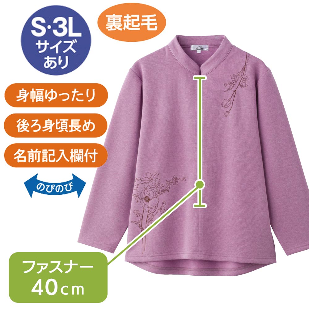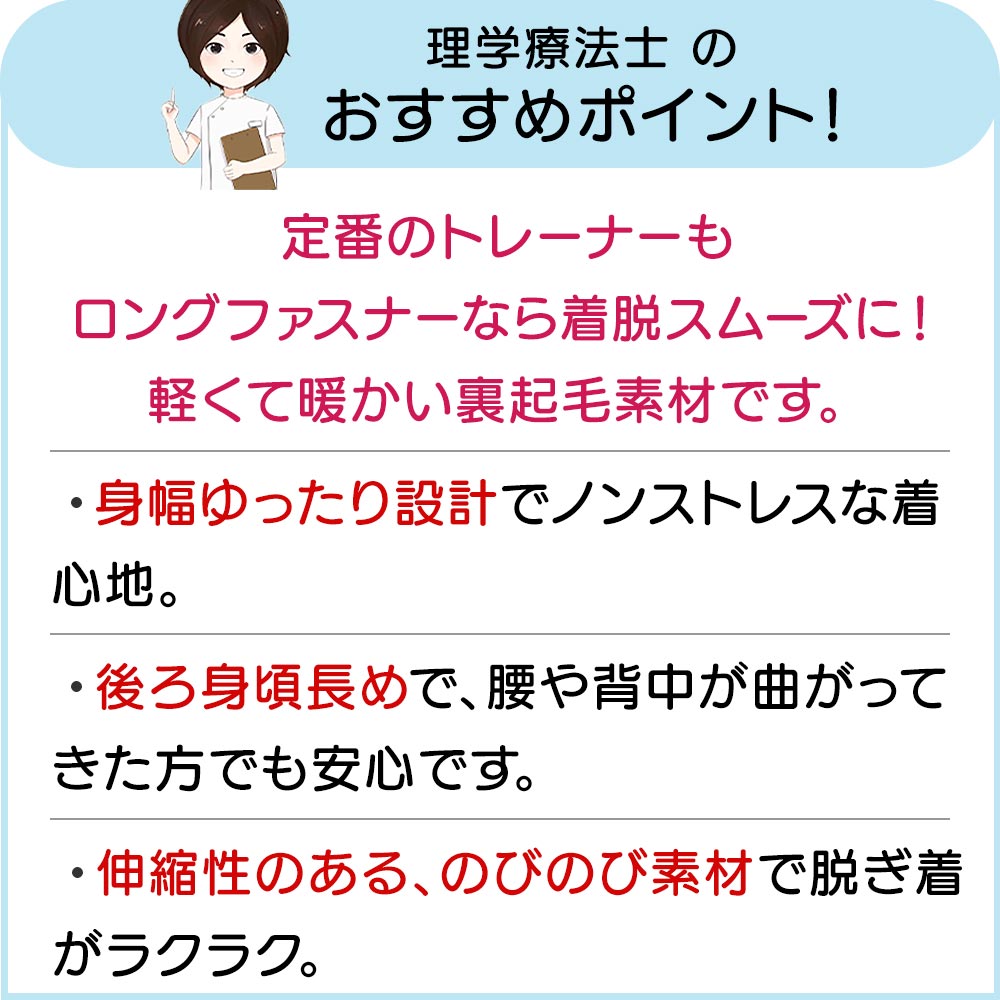 商品名 : 後ろ長め 前開き ロングファスナー トレーナー 裏起毛 婦人Tシャツ S M-L LL 3Lサイズ 介護服 前開き レディース服 介護 施設 で 着る 服 長袖 トップス 婦人用 シニアファッション 80代 秋冬 身幅ゆったり 前開きトレーナー 着脱らくらく プレゼント 入院 入所